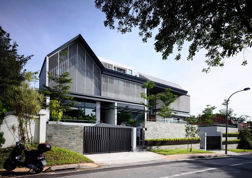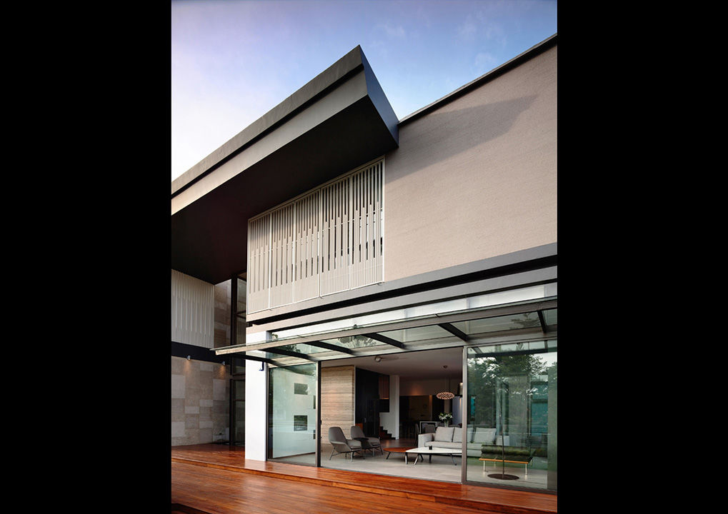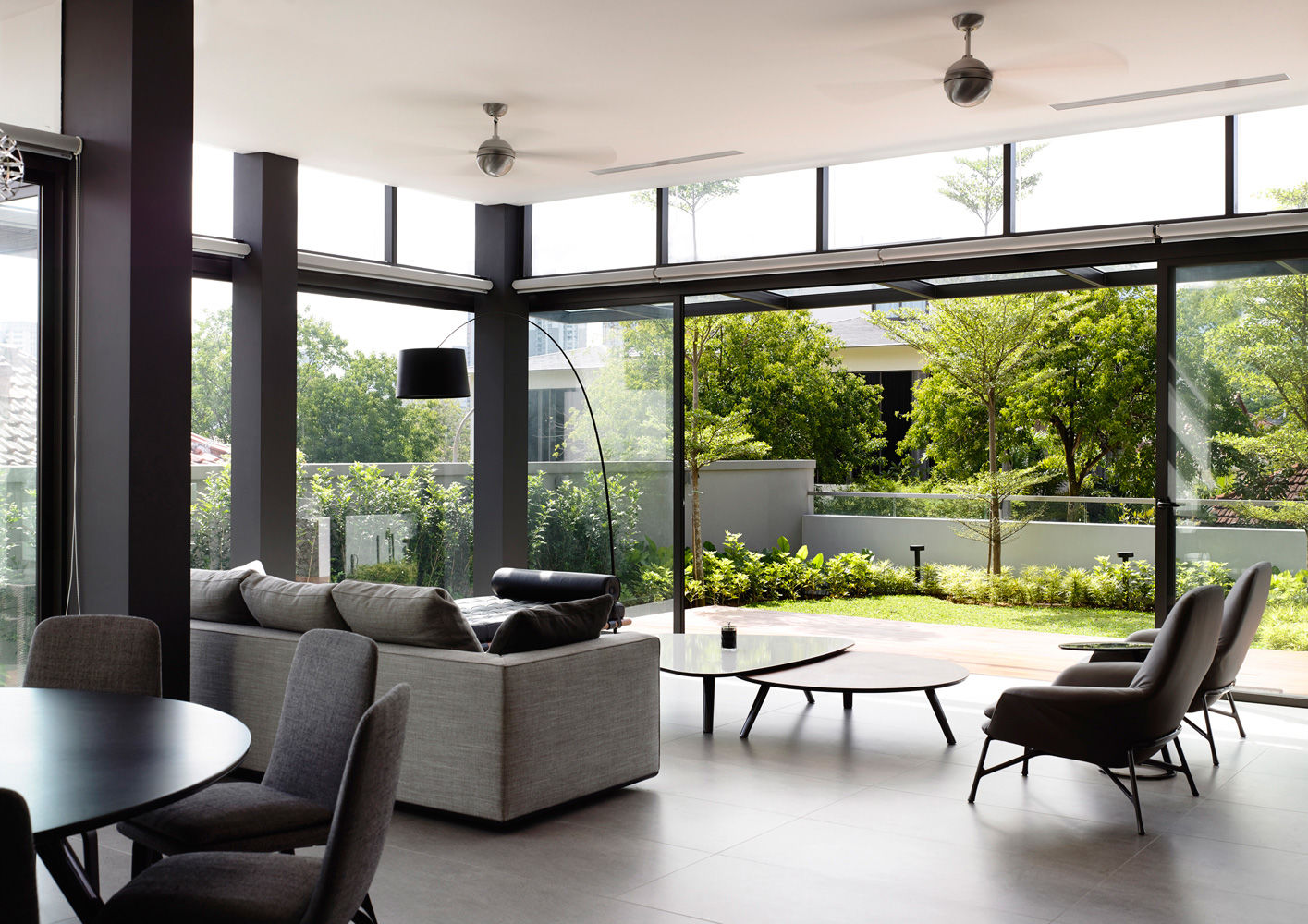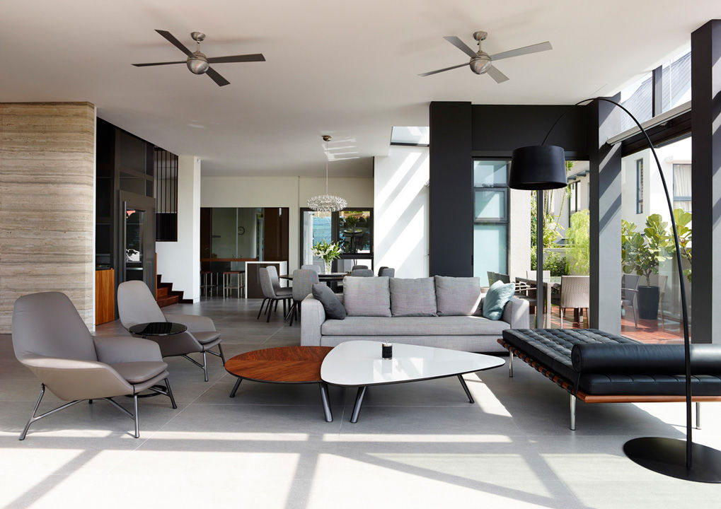 Emocionalmente ligados al bungalow donde habían vivido veinticinco años de su vida, los clientes de este proyecto encargaron expresamente al estudio A-DLab de Singapur una reforma y ampliación que conservara el espíritu de su vivienda, pero asintiendo al aprovechamiento de espacios más amplios y a la realización de dos viviendas separadas. El resultado es un armonioso chalé bifamiliar que conserva todo el encanto de la construcción original pero ofrece una serie de espacios funcionales que se abren a un jardín de lujuriante vegetación. En el amplio y luminoso espacio living hay un elegante sofá Powell revestido en tejido gris y dos sillones Prince en piel beige, con mesitas Sullivan. En la sala comedor contigua hay una mesa Evans rodeada de sillas Flavin.