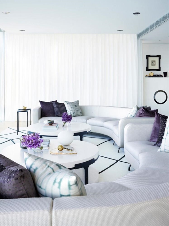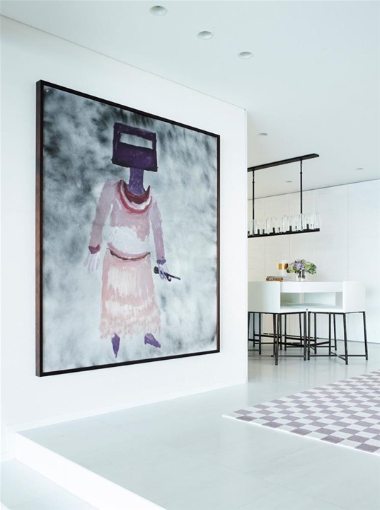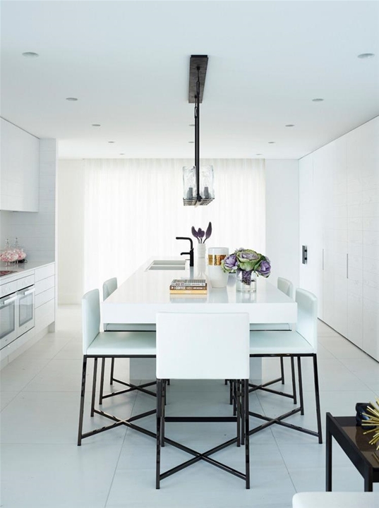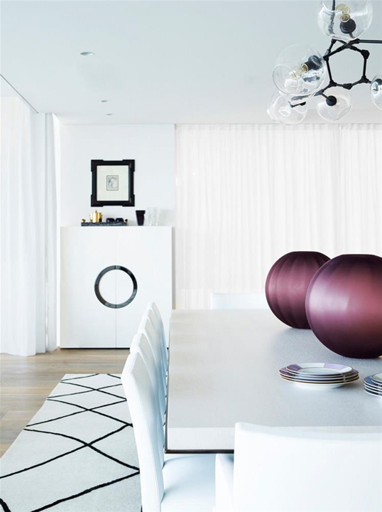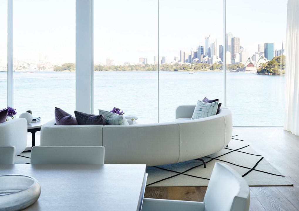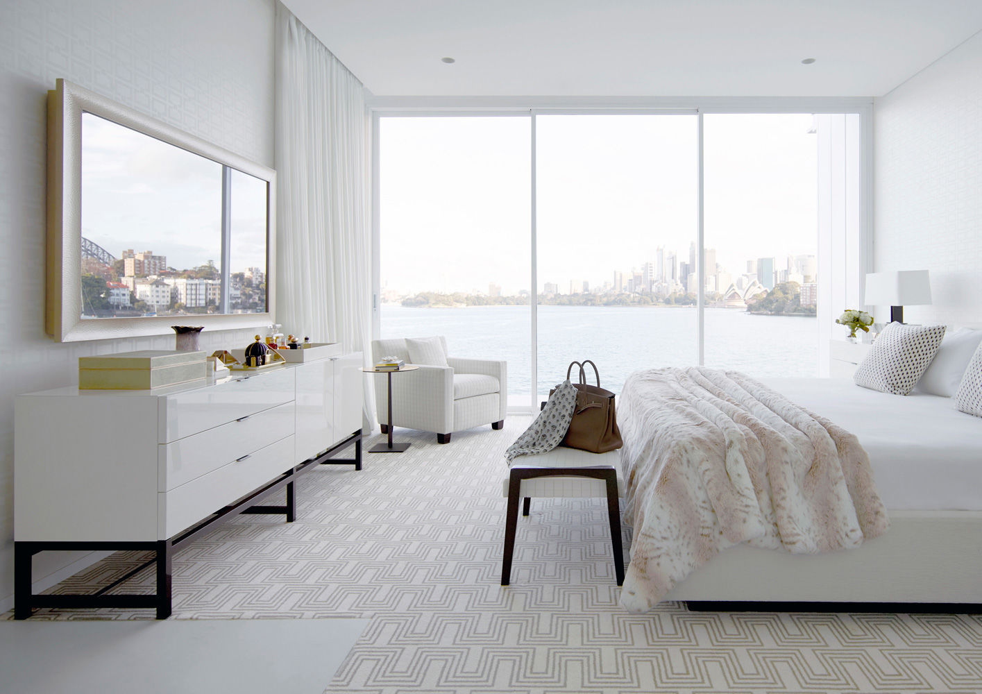 El deseo del cliente era realizar una casa de gusto sofisticado y contemporáneo. El proyecto de reforma preveía la integración de dos unidades en una única vivienda, dispuesta en varios pisos, conectados mediante una elegante escalera central y un ascensor. El estudio Greg Natale Design, artífice del brillante proyecto de diseño de interiores, dio un halo de moderna y relajada elegancia a toda la casa, gracias a la elección de colores claros para las paredes, las cortinas y los muebles, con los que hacen contrapunto los pavimentos y las puertas de madera. Para amueblar el amplio y luminoso espacio living, que goza de una magnífica vista a la bahía de Sydney, se han elegido composiciones curvas del sofá Dubuffet y un mueble Archipenko. En torno a la amplia barra de la cocina se han colocado taburetes Flynt revestidos de piel blanca, mientras que para el dormitorio se han elegido mesitas de noche Harvey, lacadas brillantes blanco.