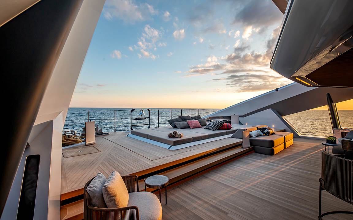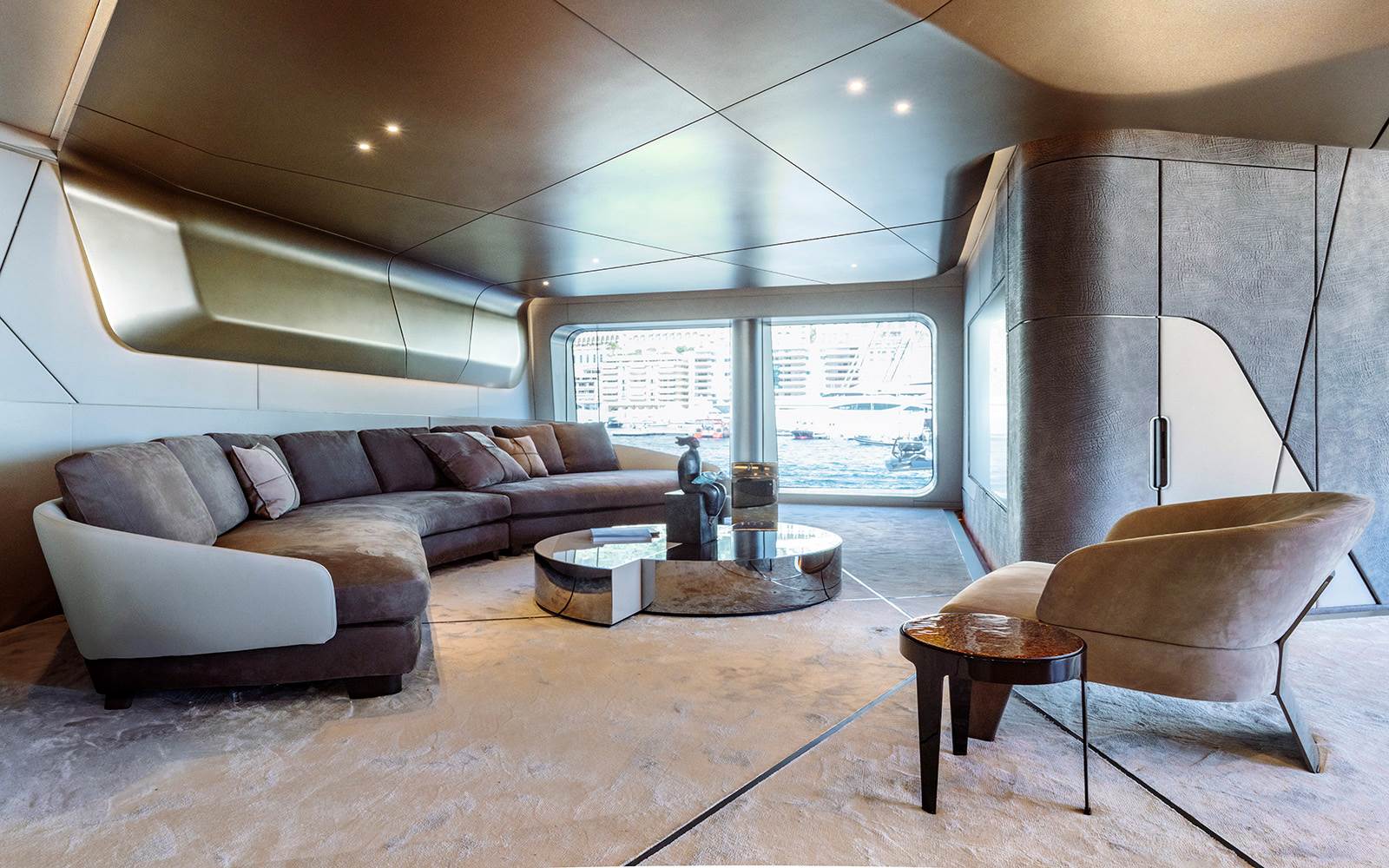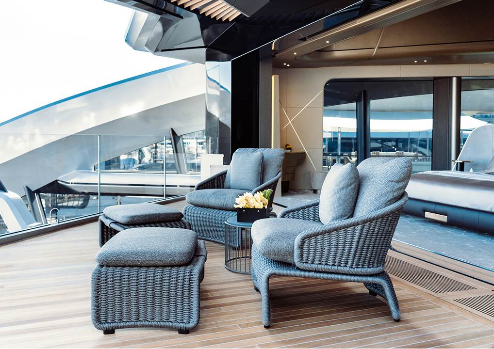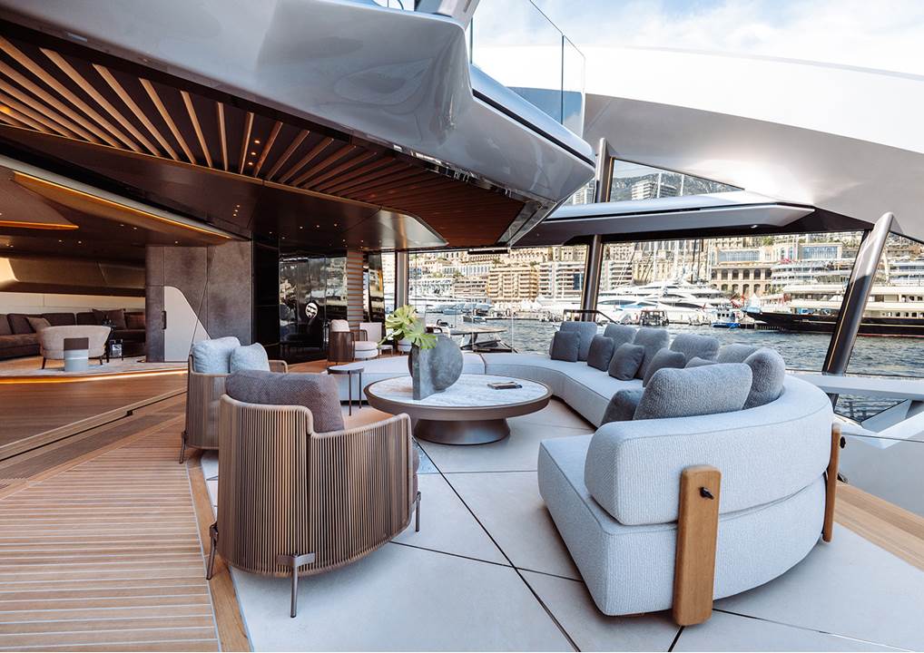 La cubierta principal de popa conecta armoniosamente con el salón interior, creando un open-space con áreas dedicadas a la convivencia: entre ellas, una zona de salón con el sofá Lawson y el sillón Reeves, ambos de Rodolfo Dordoni, da vida a una atmósfera pensada para el relax y el entretenimiento a bordo.