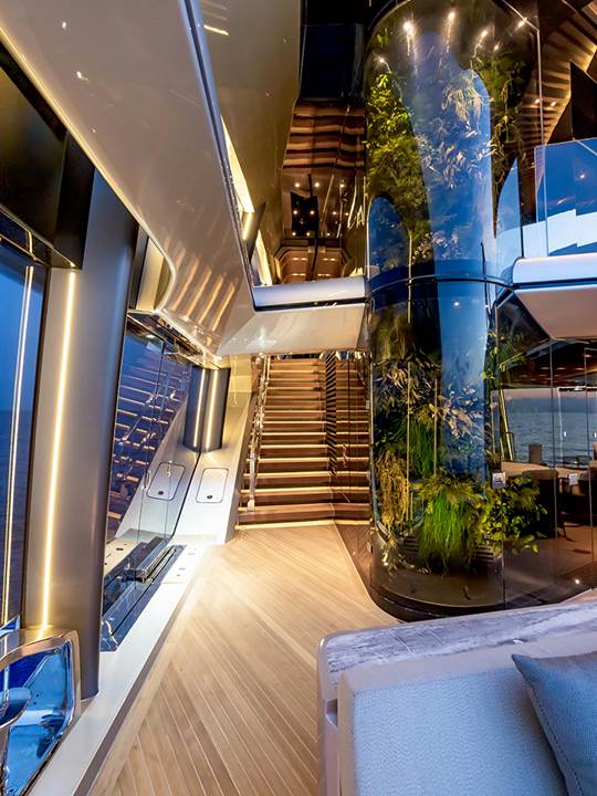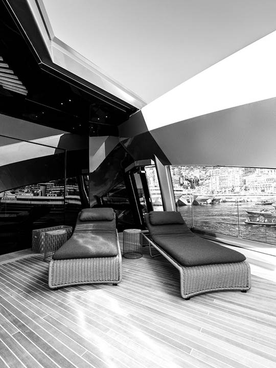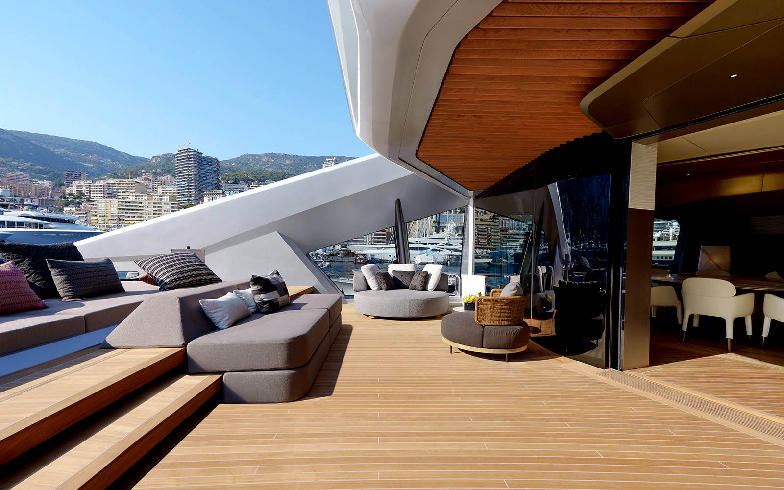 Un acceso a popa conduce a una gran cubierta asimétrica de planta abierta, amueblada con el sistema de asientos exteriores Florida de Rodolfo Dordoni y los asientos Tape Cord Outdoor de Nendo, con vistas a una espléndida piscina y dominada por el balcón de la cubierta superior: ambos puentes están atravesados por un sugerente jardín vertical que, como un oasis verde flotante, evoca la atmósfera de una villa junto al mar.