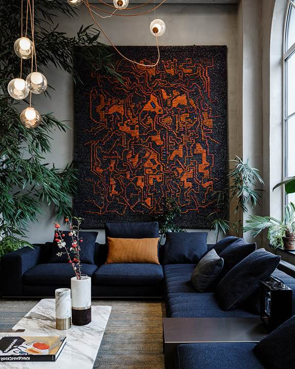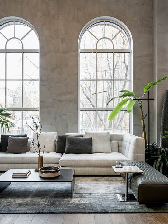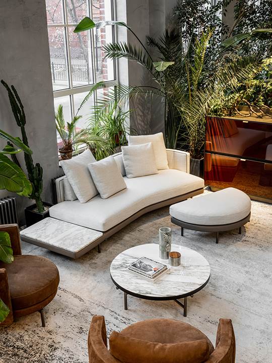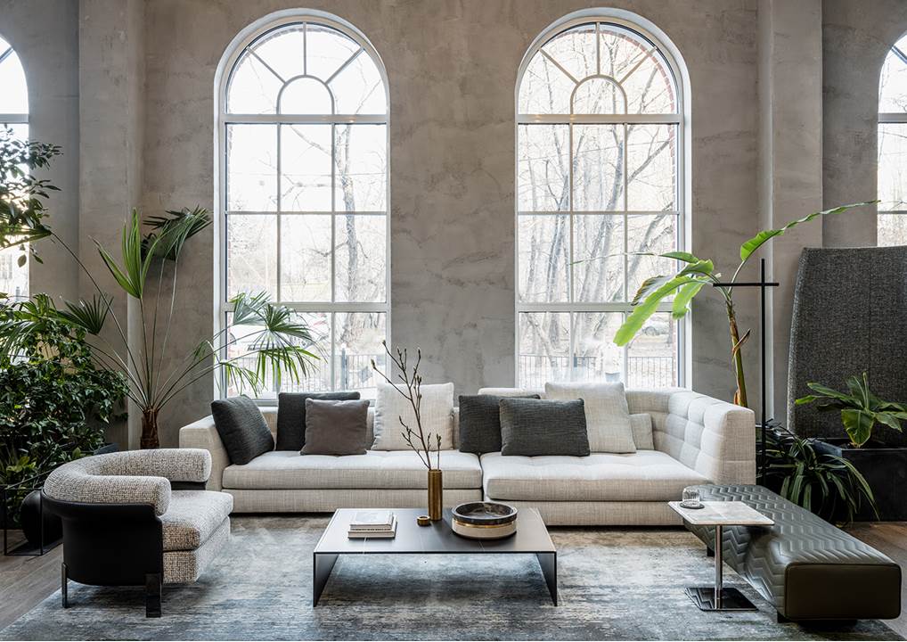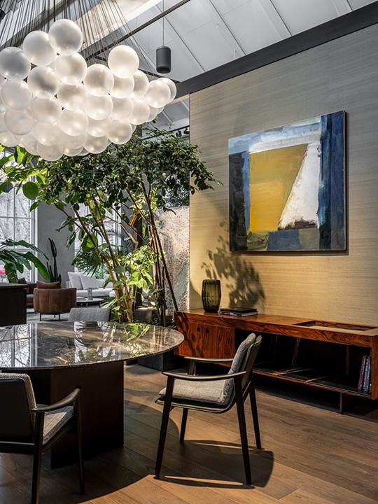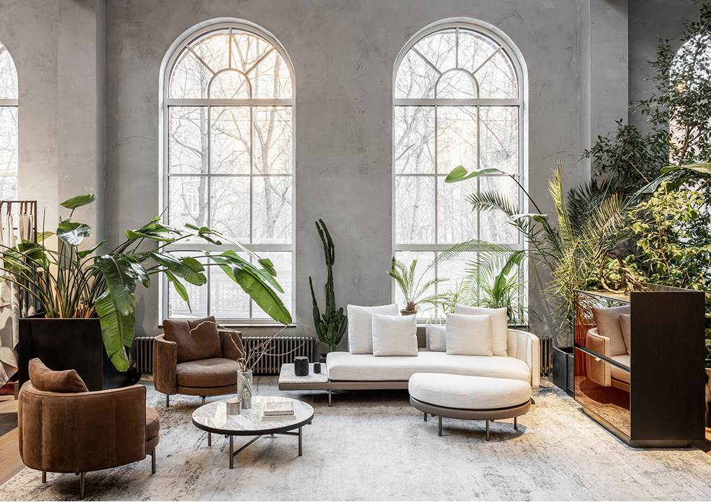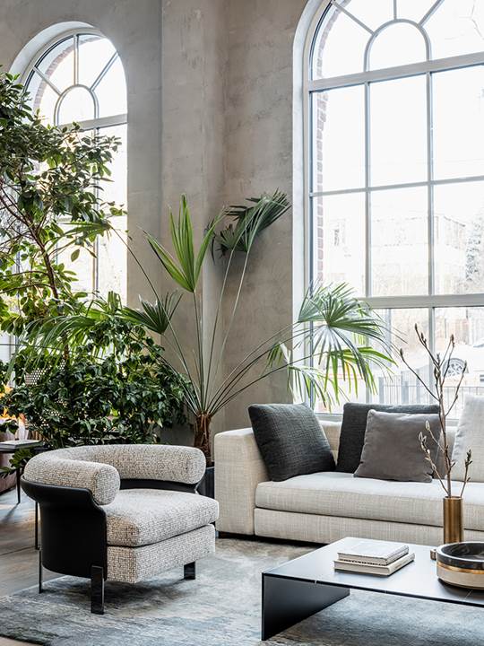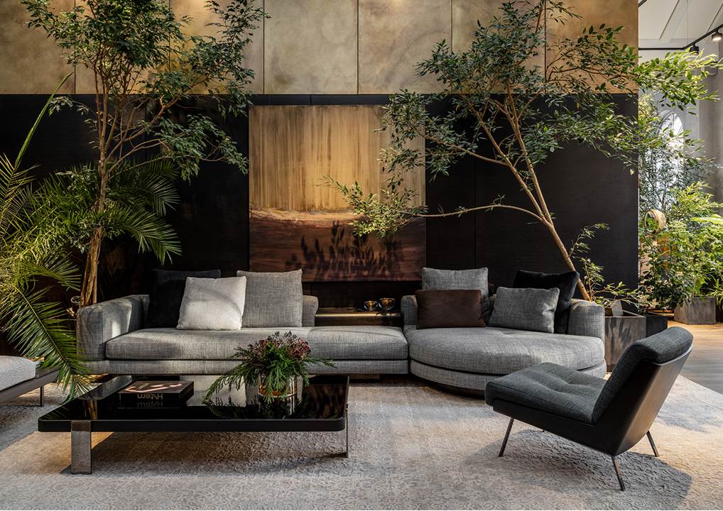 Refinadas ambientaciones de estilo contemporáneo —con altísimos techos inclinados, suelos de madera y paredes en tonos grises, adornadas con una atenta selección de obras de arte, luces de gran impacto decorativo y altas plantas verdes— configuran el ambiente ideal para mostrar las nuevas propuestas 2020.