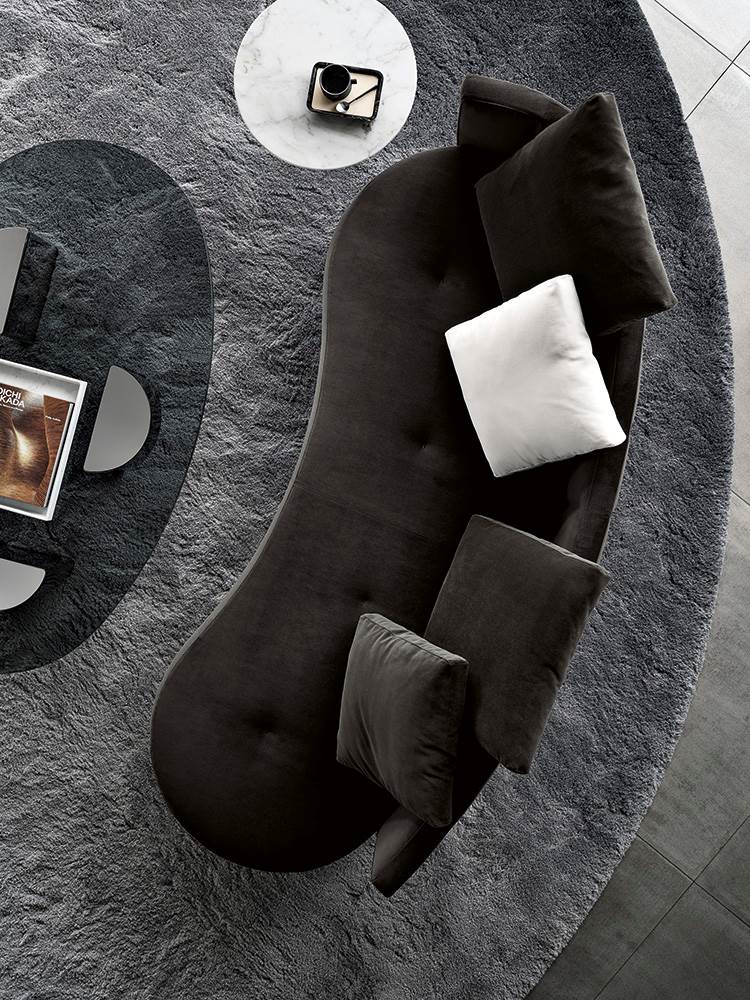 Torii Bold se caracteriza por el contraste entre los grandes volúmenes suavemente redondeados de las piezas tapizadas y la ligereza de la estructura metálica de la base sobre la que descansan.
