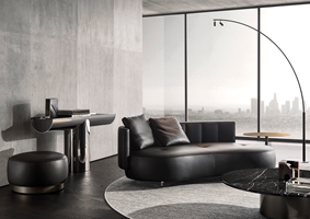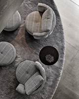 Los pufs, de diferentes formas y tamaños, reflejan el diseño de la base del sillón y, también disponibles con ruedas para facilitar el desplazamiento, permiten vivir el salón de una manera más informal.