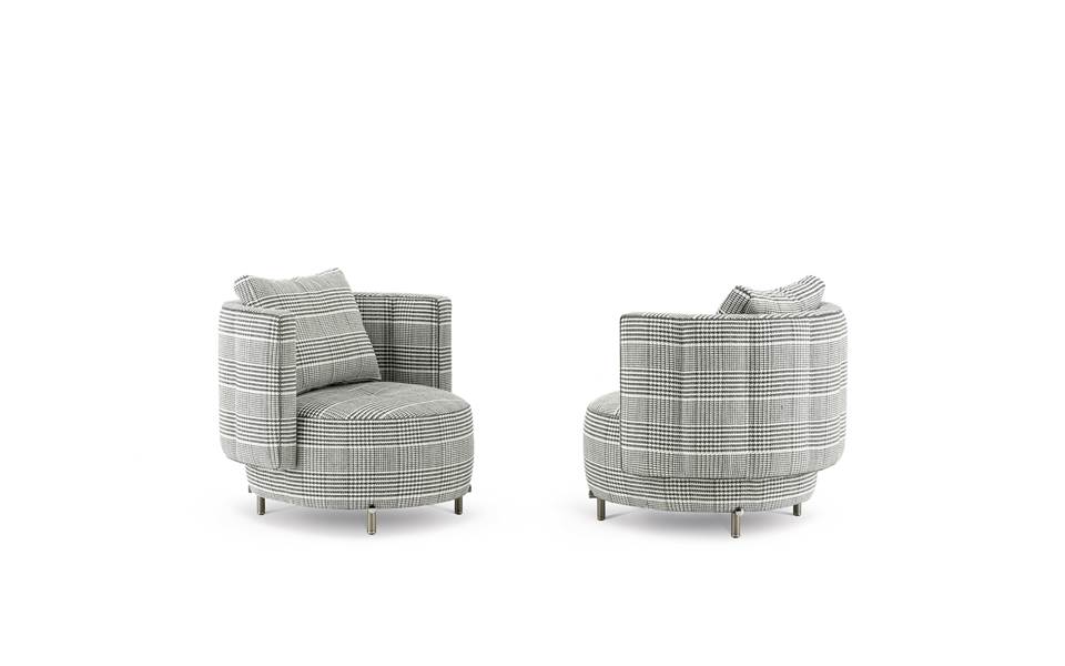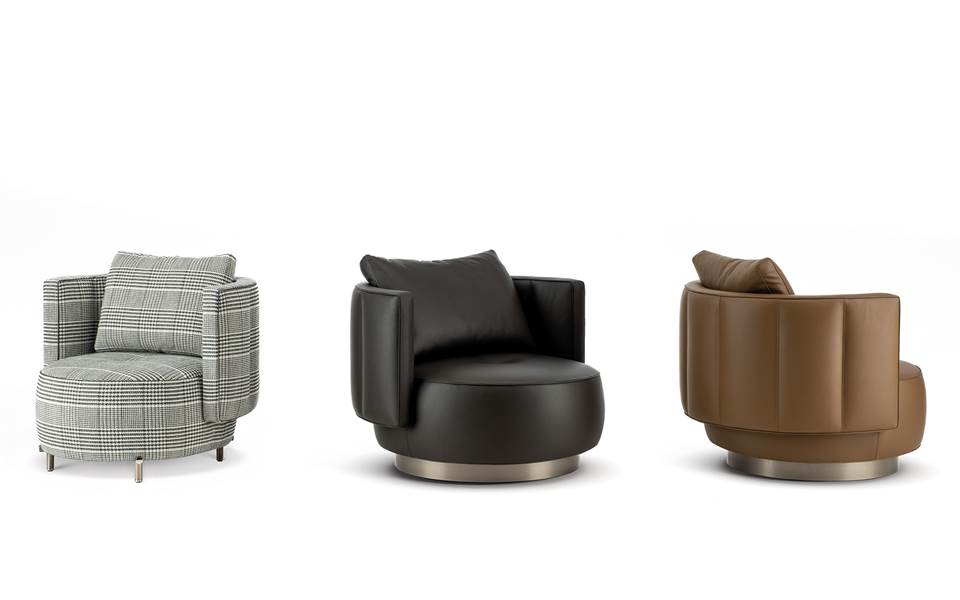 Los sillones, por su parte, están disponibles en versión fija o giratoria, esta última con una base metálica curvada que oculta el mecanismo giratorio.