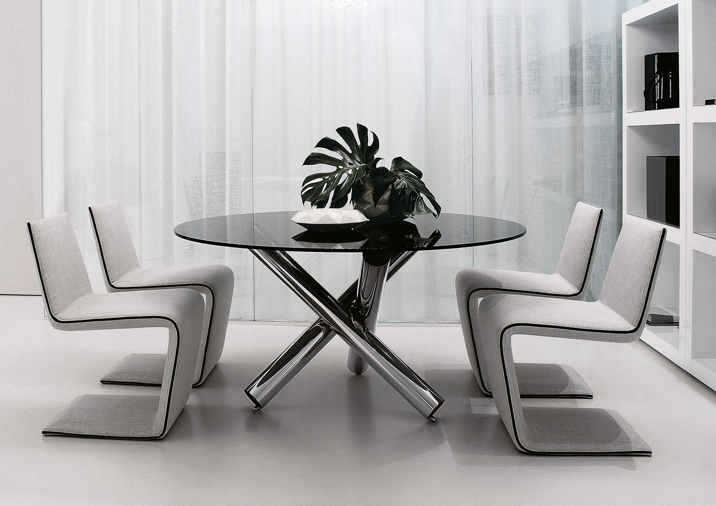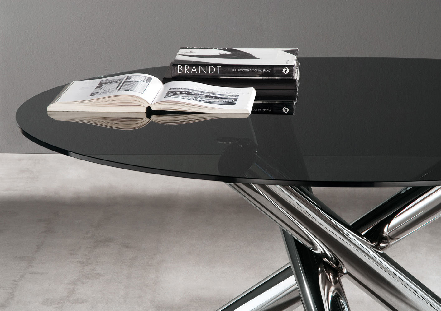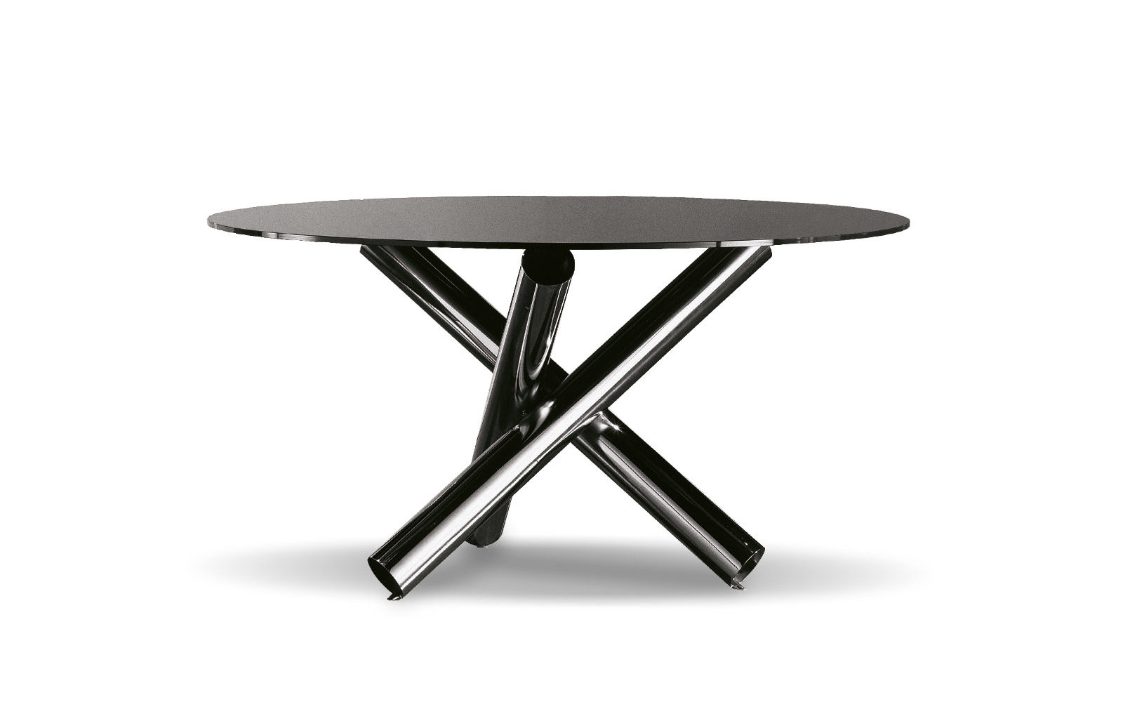 Una mesa/escultura que combina sofisticados detalles constructivos y acabados de elevado valor. La típica base de apoyo está realizada con tubos de metal de 10 cm de diámetro soldados entre sí y disponibles en los acabados cromado brillante y Black-Nickel o barnizados brillantes en los colores Mantequilla, Negro y Peltre.