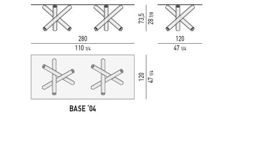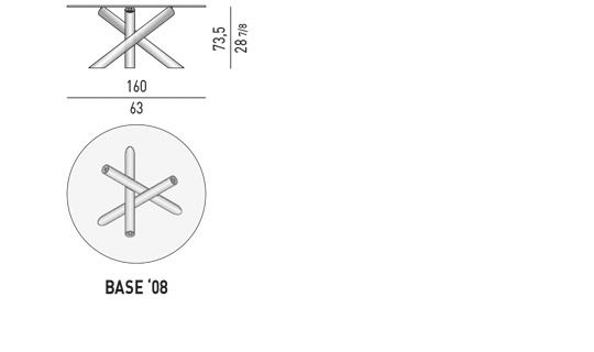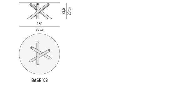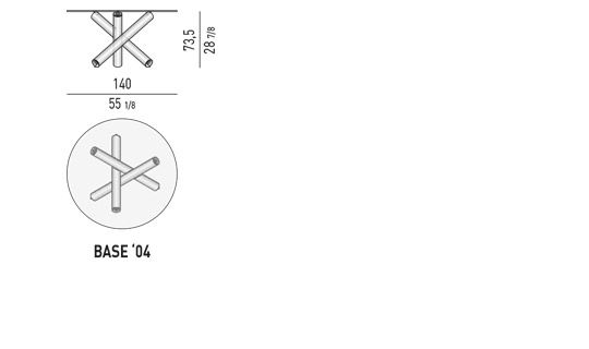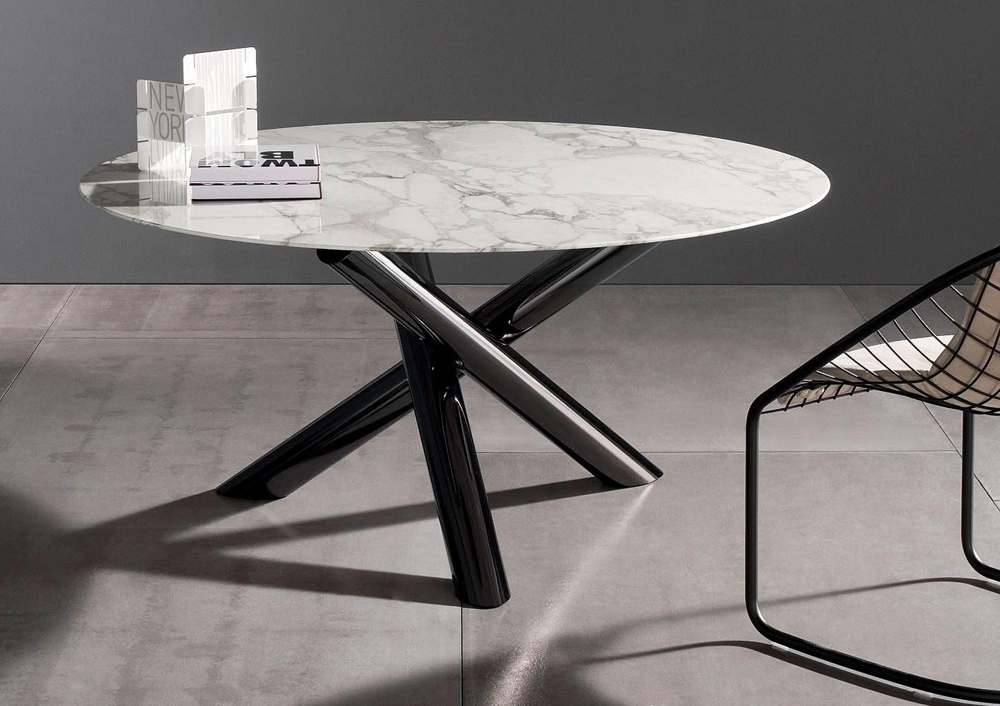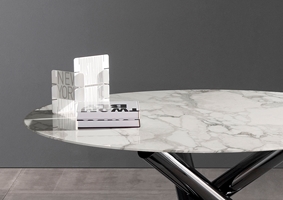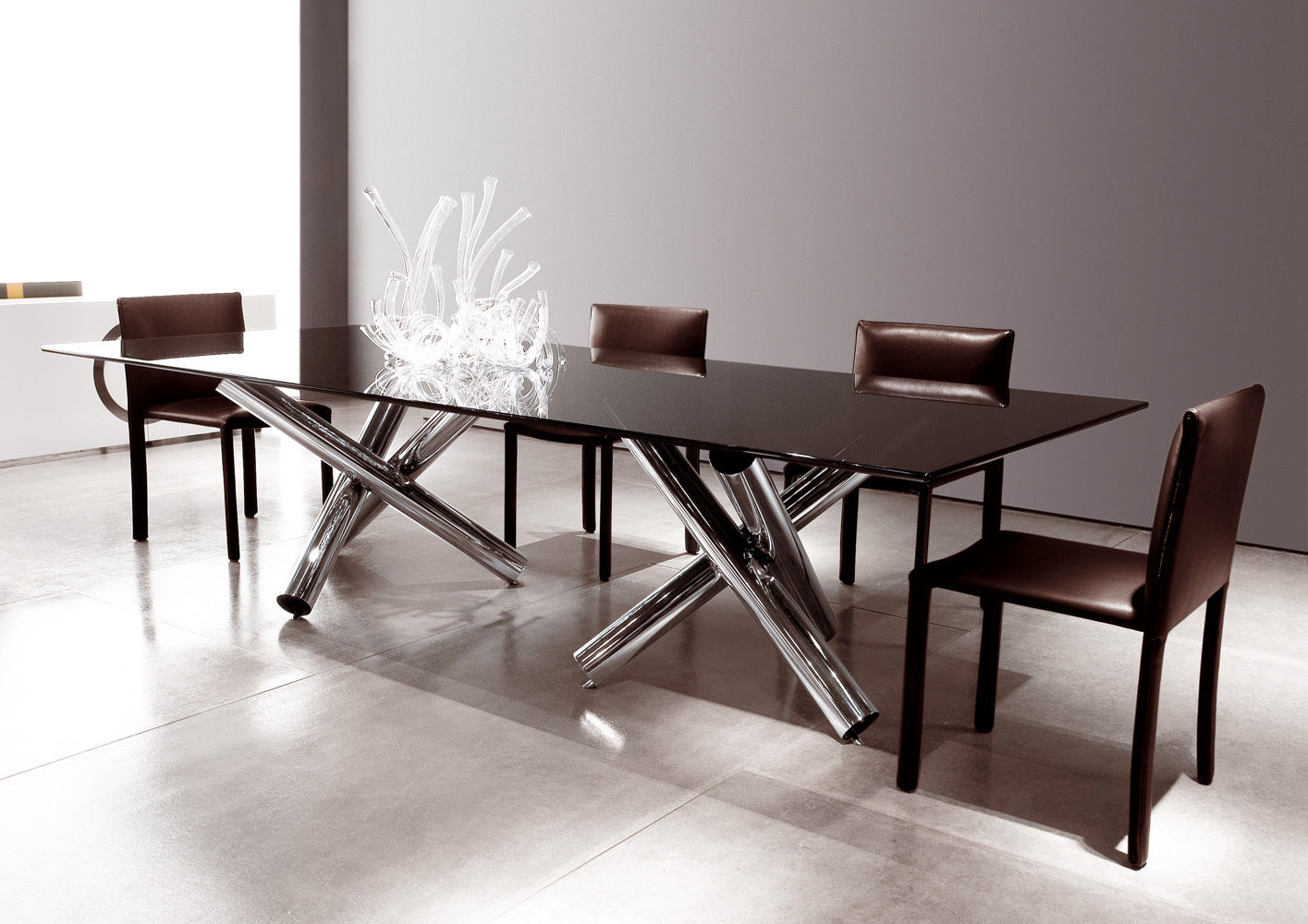 Una mesa/escultura que combina sofisticados detalles constructivos y acabados de elevado valor. La típica base de apoyo está realizada con tubos de metal de 10 cm de diámetro soldados entre sí y disponibles en los acabados cromado brillante y Black-Nickel o barnizados brillantes en los colores Mantequilla, Negro y Peltre.