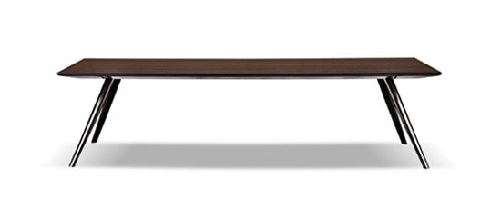 La base de apoyo es de madera maciza de Fresno curvada, con una sección de diseño altamente sofisticado que presenta un cambio de grosor en toda la longitud de la pata. Los acabados disponibles son Fresno lacado con poro abierto en color Moka y el novísimo Tabaco, un acabado pensado específicamente para la nueva colección e incorporado también en la serie de mesas Evans y en la nueva versión de Morrison.