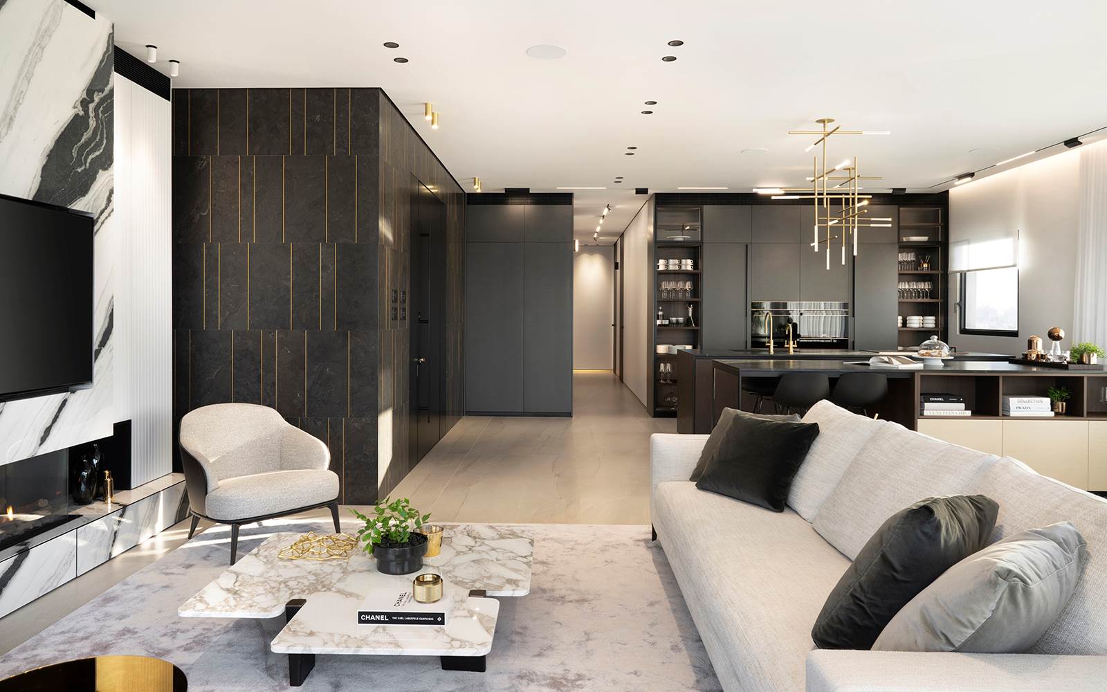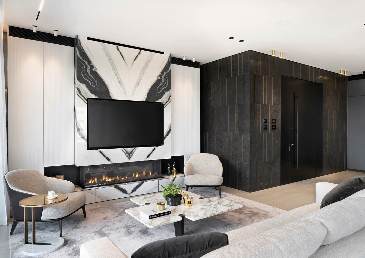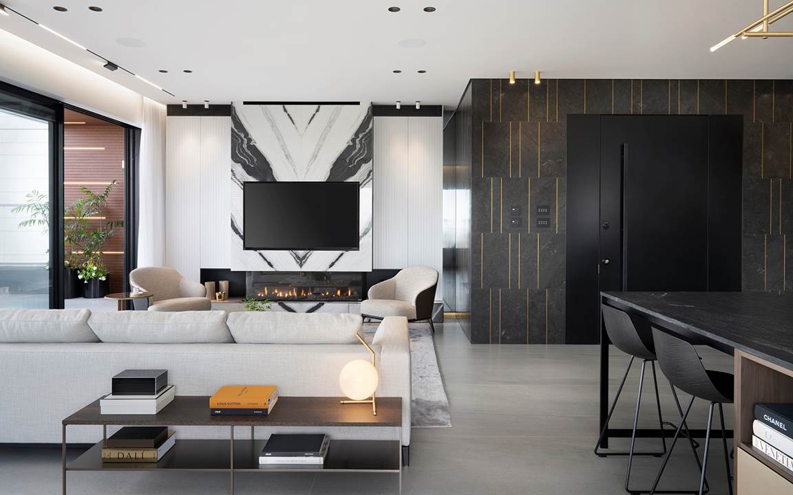 Un proyecto de interiorismo cuidado en los mínimos detalles que se caracteriza por su refinada paleta de colores y por la armónica combinación de texturas y materiales diferentes: de la escenográfica placa de mármol Panda que enmarca el televisor de su amplia sala de estar a las preciadas maderas seleccionadas para la zona exterior. Amplias cristaleras hasta el techo conectan estas dos áreas favoreciendo la entrada de la luz natural y una fluida comunicación entre los espacios internos y externos, que ha sido enfatizada mediante el uso del mismo revestimiento de cerámica efecto granito en los suelos de ambos ambientes: una solución que evidencia la voluntad de diseñar un gran salón sin confines aparentes entre el interior y el exterior.