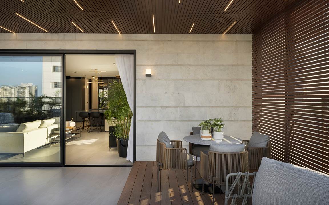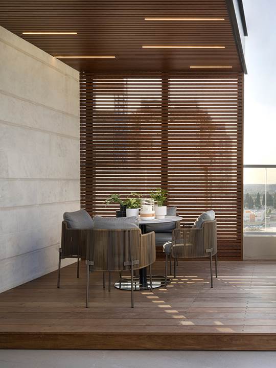 La sofisticada elegancia de los ambientes internos impregna también su espaciosa terraza, dotada de una vista espectacular de la ciudad y decorada con las butacas Tape "Cord" Outdoor de Nendo en torno a una elegante mesa redonda Bellagio "Bistrot" Outdoor con tablero en Beola Plateada firmada por Gordon Guillaumier.
