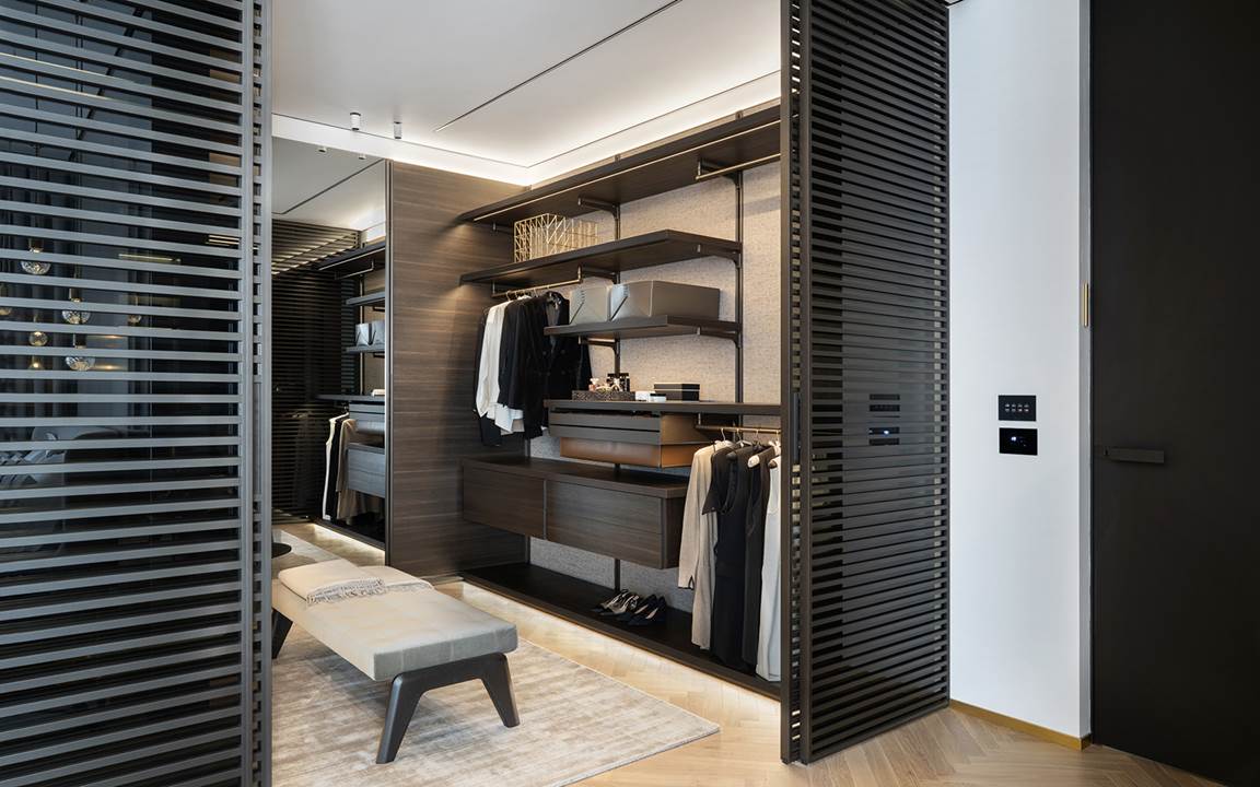 Para el guardarropa adyacente al dormitorio principal se ha elegido el banco Kirk, embellecido por la presencia de la piel y de un motivo capitonné extraordinariamente refinado y sartorial. Todas las piezas de interiores, los asientos y los complementos llevan la firma de Rodolfo Dordoni.