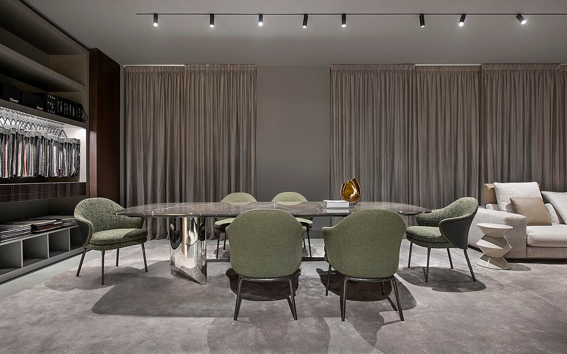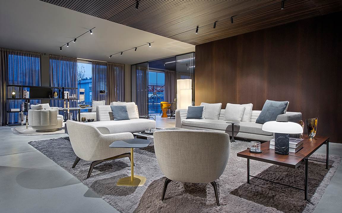 Aux côtés du fauteuil Raphael de GamFratesi habillé d’un élégant tissu Prince de Galles, le système de sièges modulaires Dylan signé Rodolfo Dordoni - l’un des plus récents produits de la marque - donne naissance à un très bel agencement de séjour. Un autre espace accueille quant à lui les volumes délicatement arrondis de la famille de sièges Torii Bold conçue par Nendo et gage d’un contexte lounge à la fois informel, original et moderne.