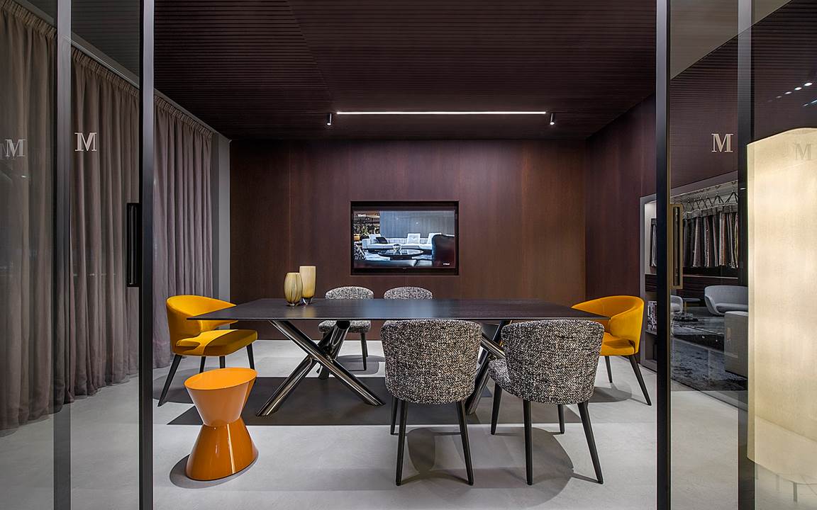 Encadré par des boiseries en chêne flammé teinté tabac et rythmé par des panneaux laqués, le parcours d’exposition prend la forme d’une expérience de design particulièrement envoûtante résultant de l’harmonieuse alternance des agencements de séjours et de salles à manger qui jalonnent l’espace ouvert.