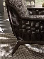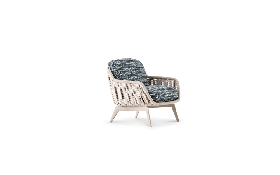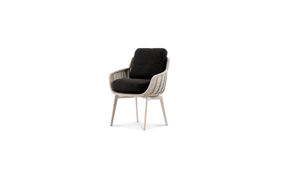 En parfait accord chromatique avec les teintes des cordes, les assises reposent sur une base en aluminium peint mat dans les nuances Écru et Marron Foncé. Elles sont dotées de coussins rembourrés en polyuréthane expansé à haute résilience revêtus de fibres et de tissu déperlant.
