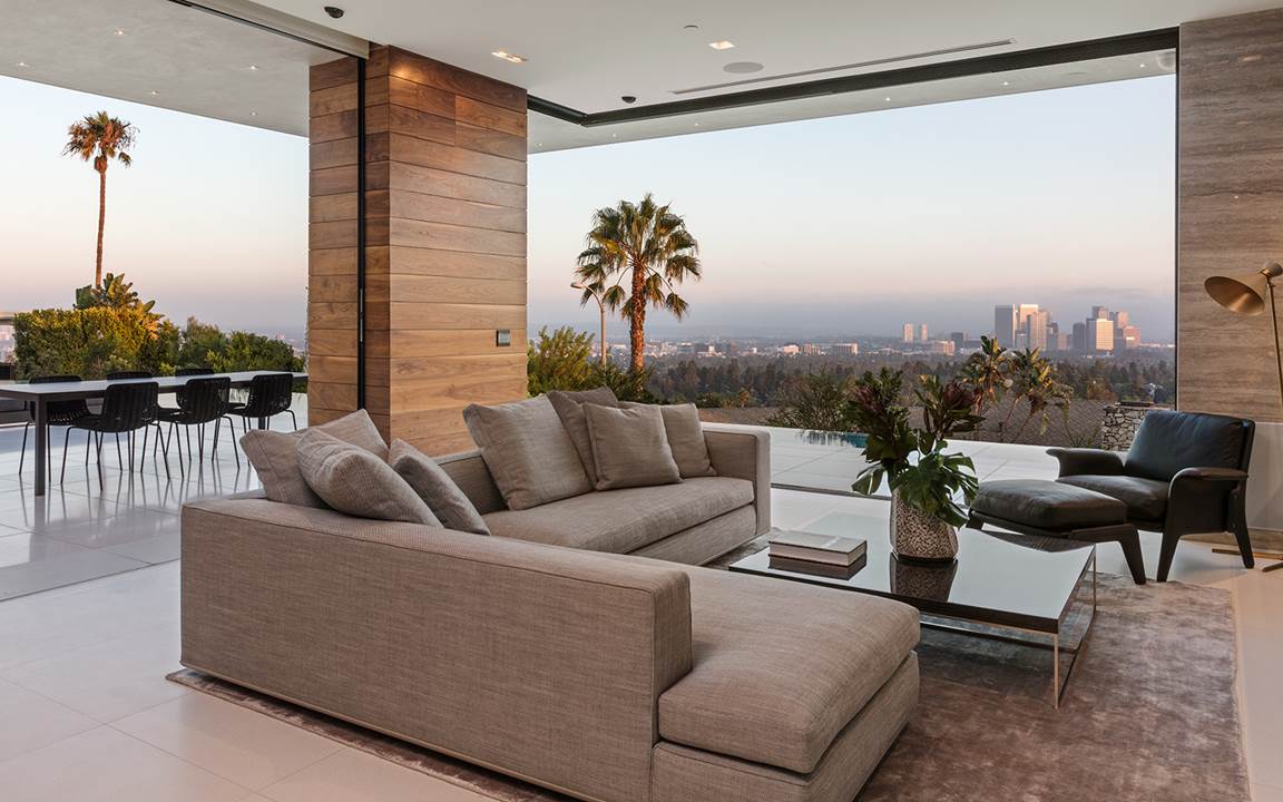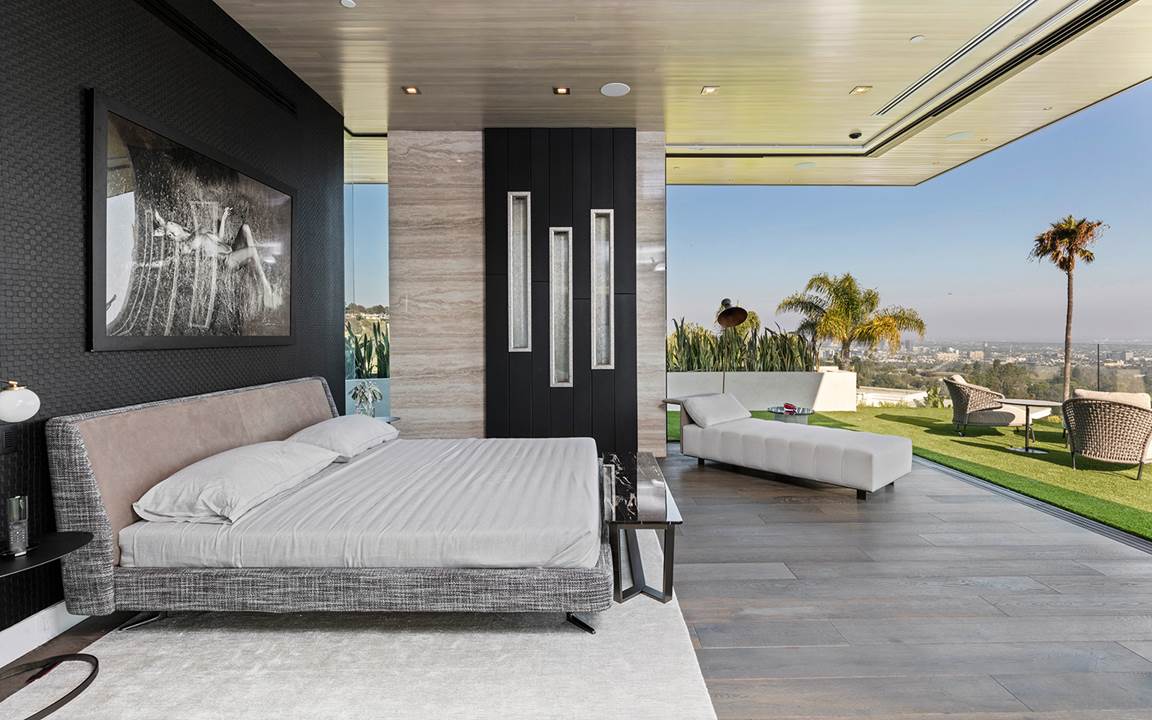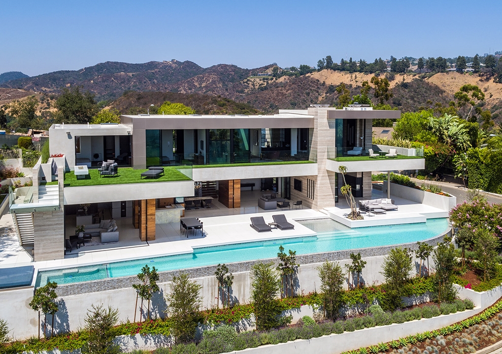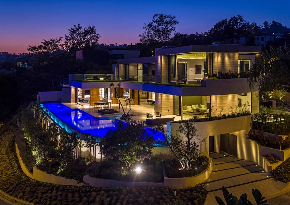 Située dans une position enviable au sein de l’enclave la plus prisée de Beverly Hills, l’habitation conçue par Joseph Ferrugio, fondateur du cabinet Ferrugio Design & Associates embrasse d’un seul regard Downtown, Century City, The Valley et, au-delà, l’océan. Un jeu dynamique de couleurs et de textures imprègne l’ouvrage, caractérisé par des plafonds et des murs lambrissés de noyer ainsi que des traits distinctifs tels qu’une salle de bains ornée de dalles en améthyste et un ascenseur contenu dans une capsule en résine futuriste.