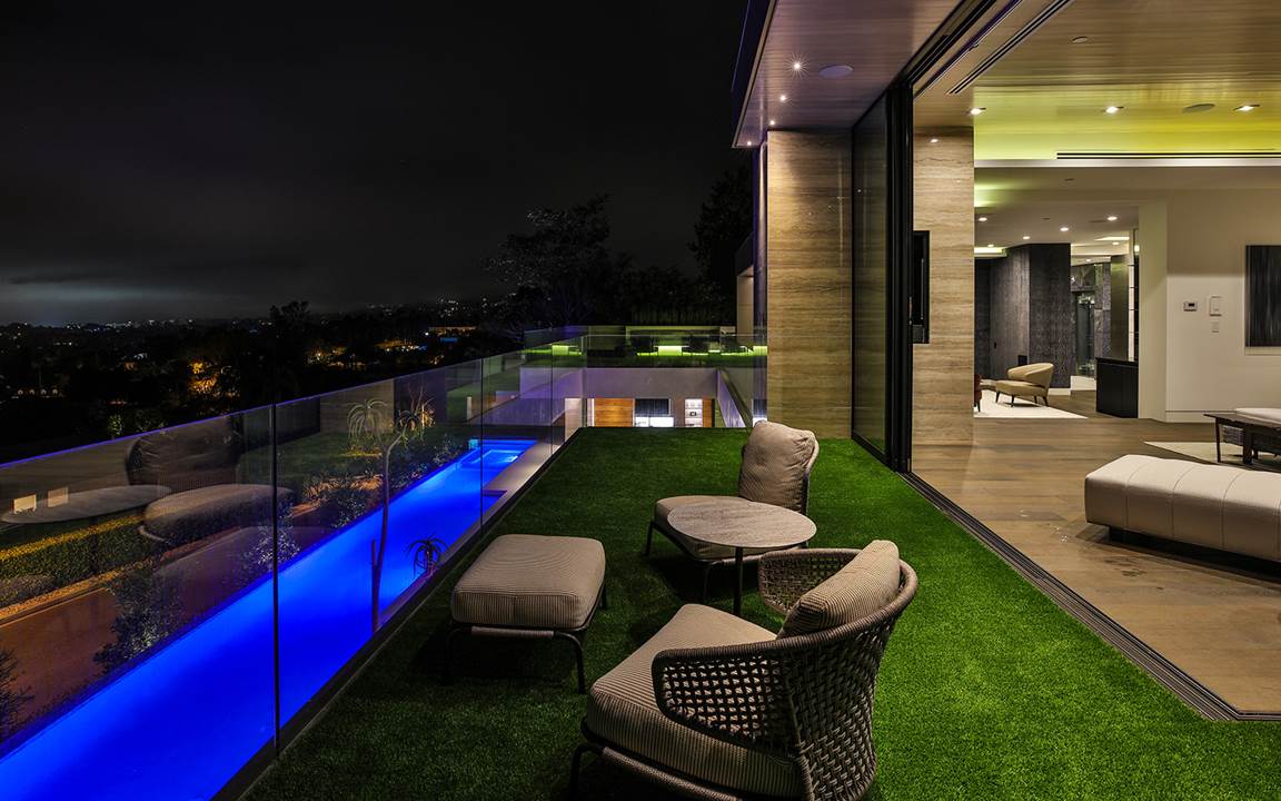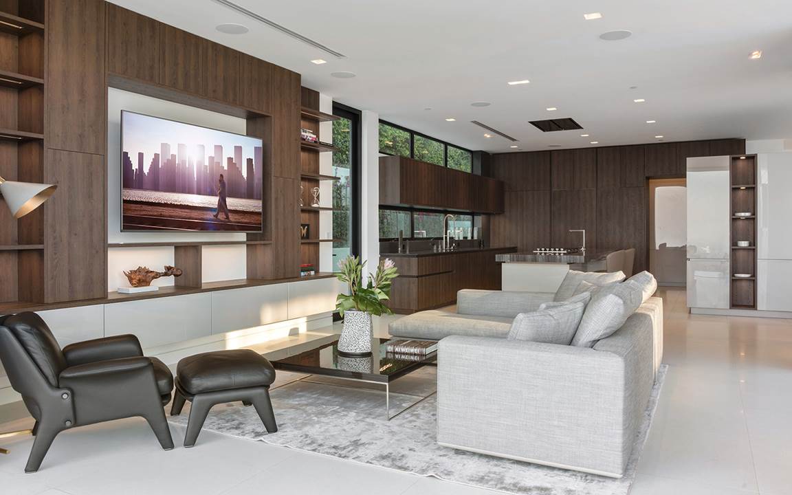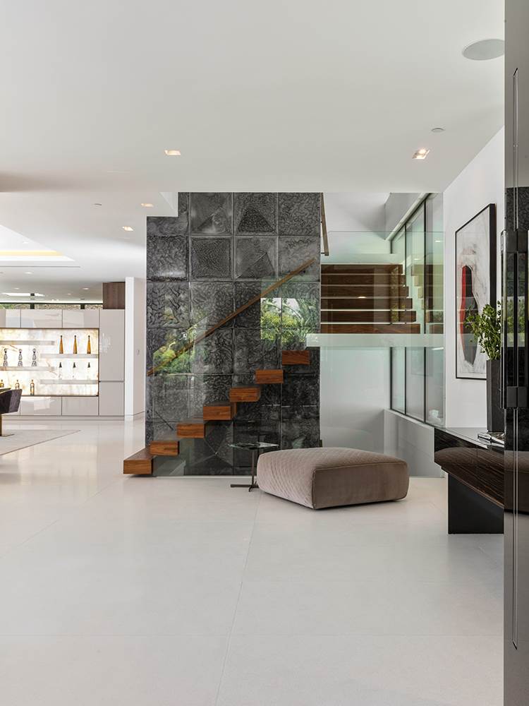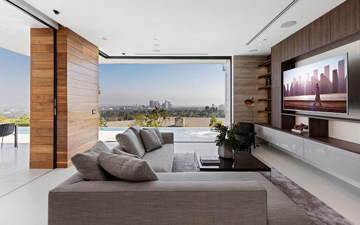 Située dans une position enviable au sein de l’enclave la plus prisée de Beverly Hills, l’habitation conçue par Joseph Ferrugio, fondateur du cabinet Ferrugio Design & Associates embrasse d’un seul regard Downtown, Century City, The Valley et, au-delà, l’océan. Un jeu dynamique de couleurs et de textures imprègne l’ouvrage, caractérisé par des plafonds et des murs lambrissés de noyer ainsi que des traits distinctifs tels qu’une salle de bains ornée de dalles en améthyste et un ascenseur contenu dans une capsule en résine futuriste.