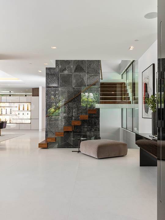 Au niveau -1, les plantes grimpantes créent un mur végétalisé qui cache en partie la cave, le home cinéma, l’espace bien-être, le bar en marbre Calacatta agrémenté d’une baie vitrée permettant d’observer ceux qui nagent dans la piscine au-dessus ainsi qu’un garage pour six voitures. La piscine à débordement en forme de croissant et mesurant 33 mètres de long semble se déverser sur le flanc de la colline.