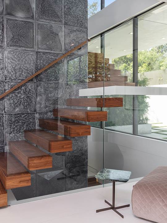 Les portes escamotables automatisées créent un flux continu entre intérieur et extérieur permettant de saisir des vues cachées. Les escaliers suspendus en noyer mènent du premier étage accueillant la pièce à vivre à l'étage supérieur où les chambres donnent sur une sinueuse terrasse en ruban traversée par une pelouse verte.