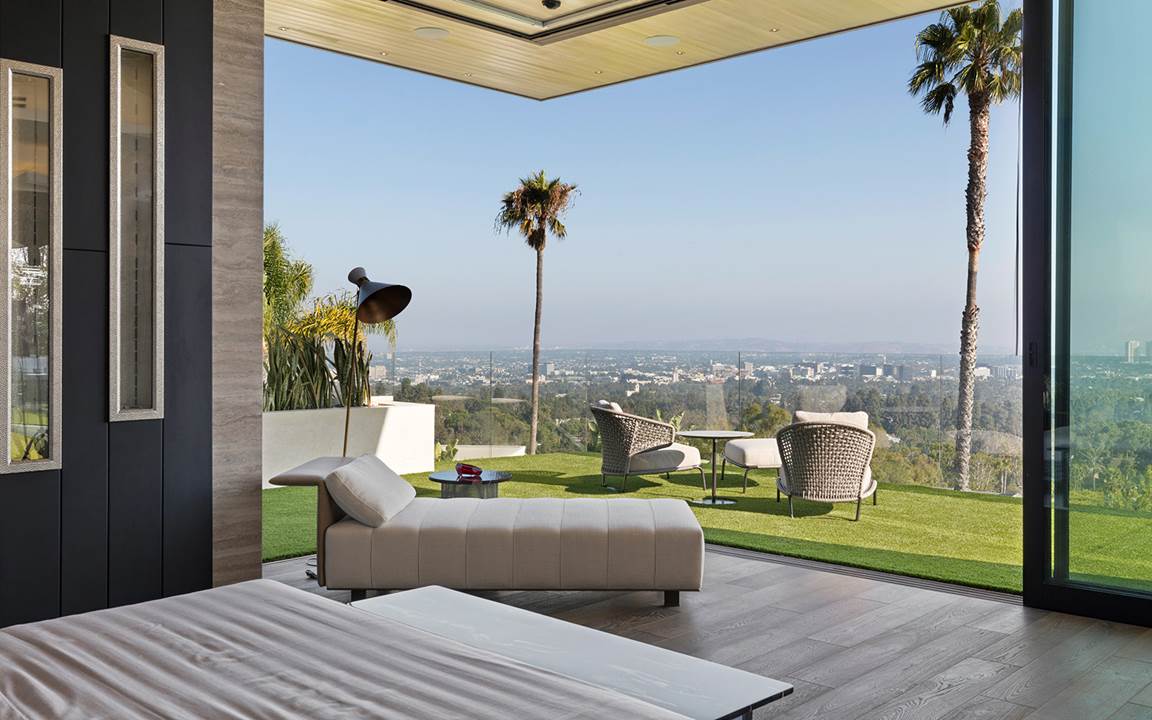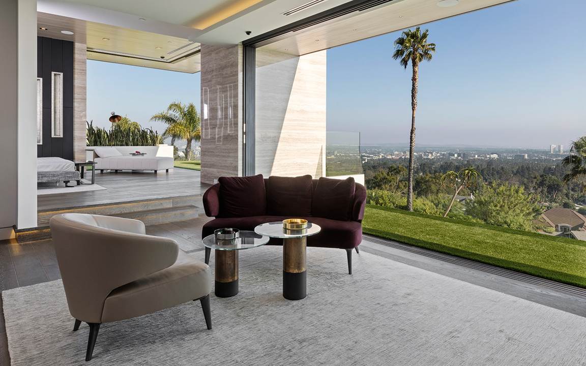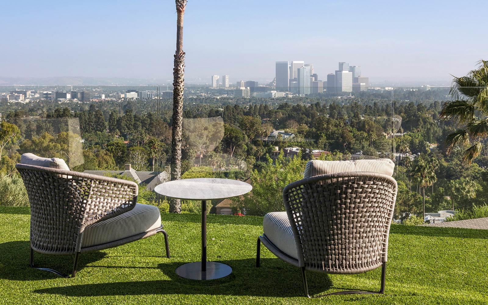 Dans l’espace nuit, les lignes sinueuses et la tête de lit enveloppante du lit Spencer dominent la chambre, qui accueille également une chaise longue Freeman. Dans le salon adjacent, le fauteuil et le canapé Aston de style rétro sont réinterprétés via un dialogue de variations de couleurs. Ce dialogue se poursuit sur la terrasse avec un duo de fauteuils Aston "Cord" Outdoor et la petite table Bellagio, placés en position stratégique comme s’ils étaient suspendus au-dessus du paysage s’étendant au pied de Beverly Hills.