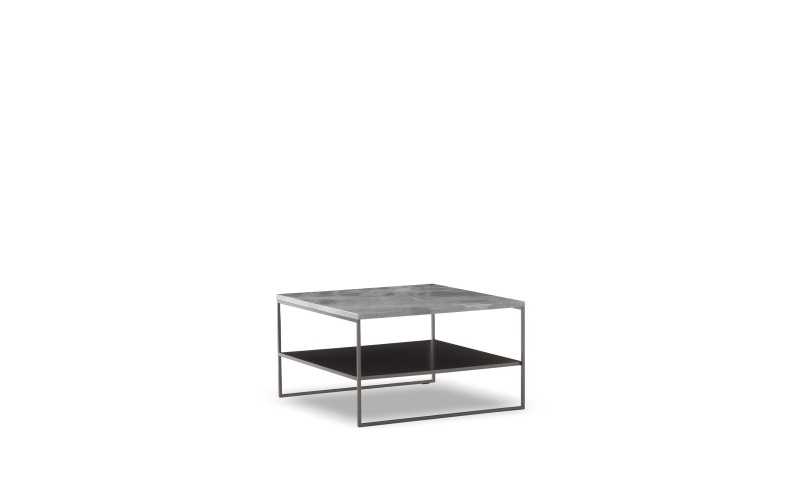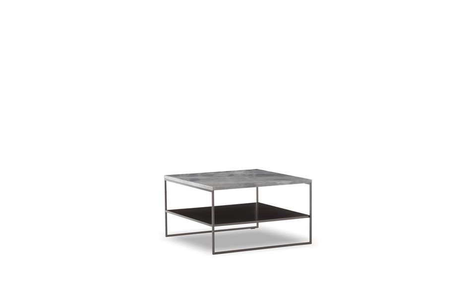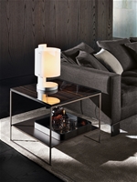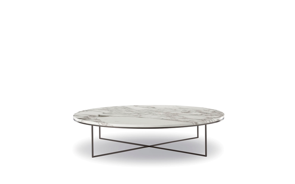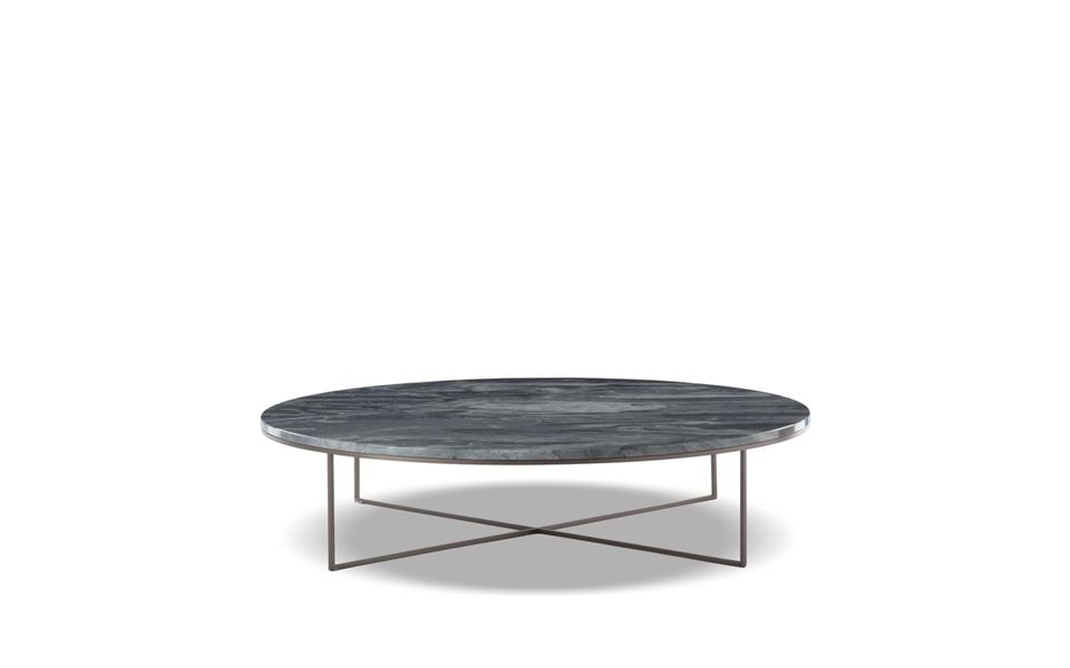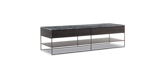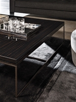 La mince structure en fer existe maintenant dans la finition satiné couleur Bronze. Le plateau est disponible dans les nouvelles versions : laqué brillant Sand, plaqué Sucupira teinté Vison et en marbre Bardiglio Nuvolato et Calacatta. Le plateau intermédiaire est lui aussi en métal satiné peint Bronze.