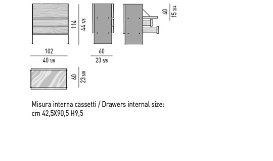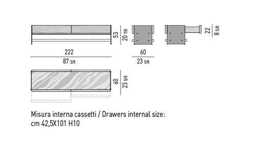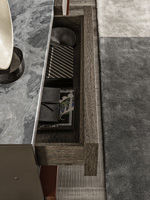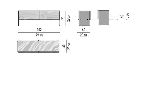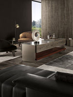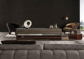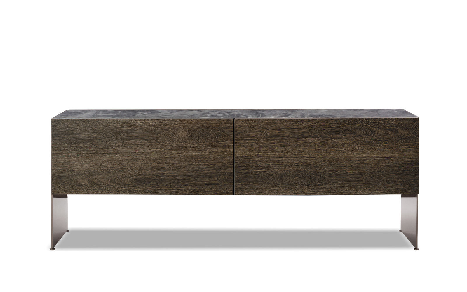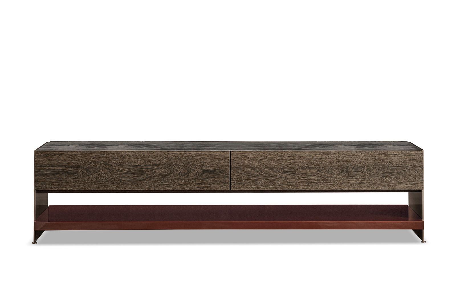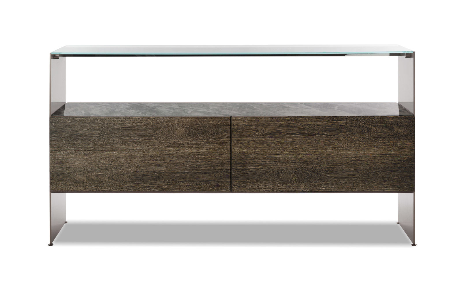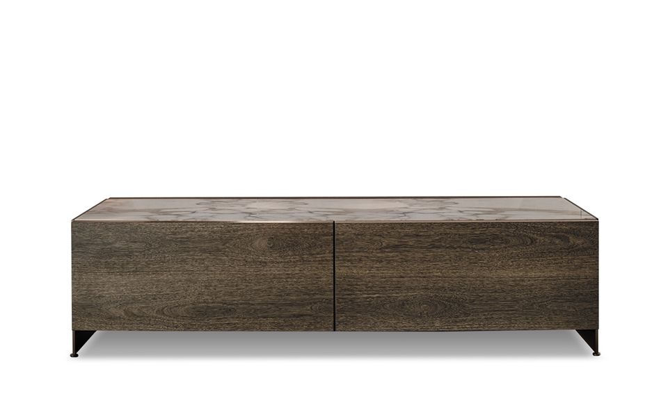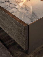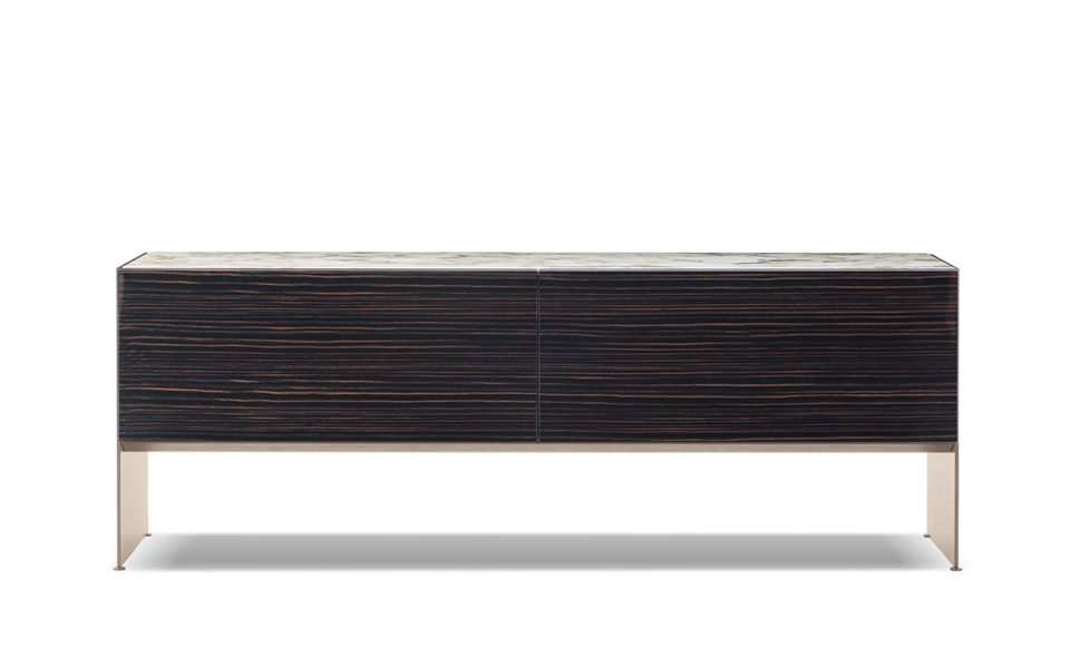 La structure est en MDF plaqué en bois de sucupira teinté Vison ou en ébène laqué à pores ouverts. Les flancs des éléments, posés sur le sol, sont en métal satiné de couleur bronze. Les plateaux, au contraire, sont disponibles en marbre Bardiglio Nuvolato ou en marbre Calacatta, tous deux insérés à ras de la structure.
