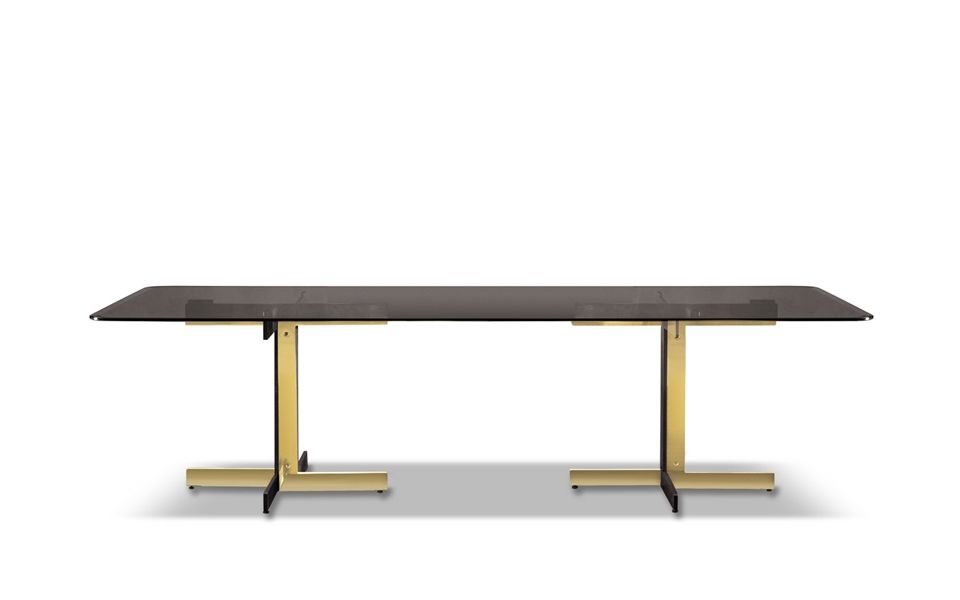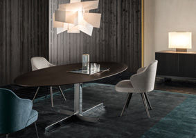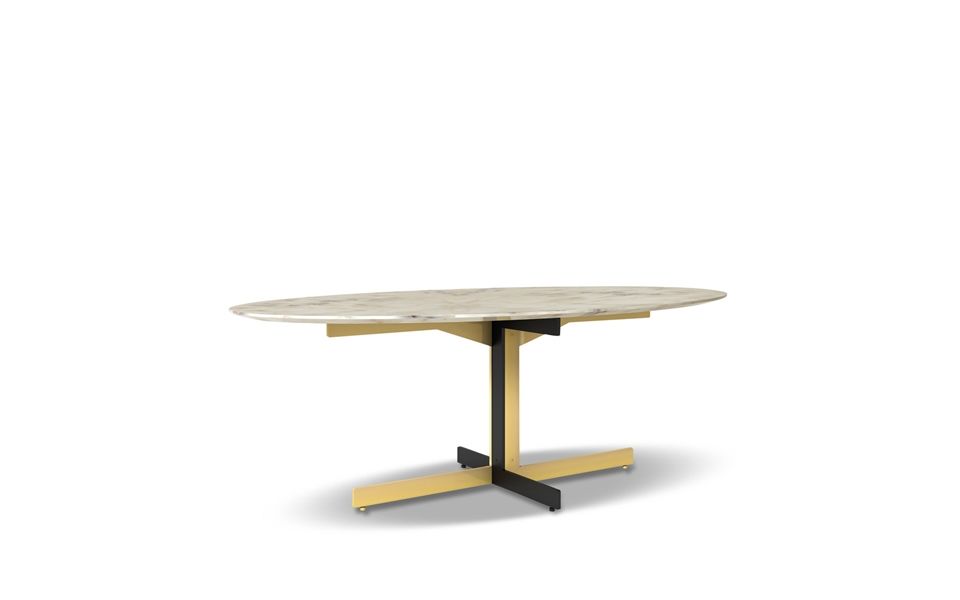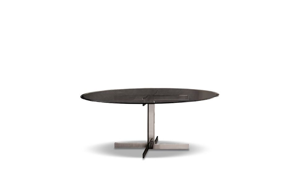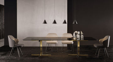 La collection de tables de repas Catlin se distingue par un appui au sol au dessin délibérément simple, décliné dans une surprenante combinaison de matériaux : noir gaufré associé à la finition Chrome brillant ou à la finition Or brillant. Le plateau caractérisé par un bord arrondi présente une variété de formes - rond, ovale et rectangulaire – dans une pluralité de dimensions et de finitions : de la matéricité chaleureuse du bois de chêne, laqué Moka à pores ouverts, au raffinement du marbre Arabescato Purple brillant à la modernité du verre Gris Fumé.