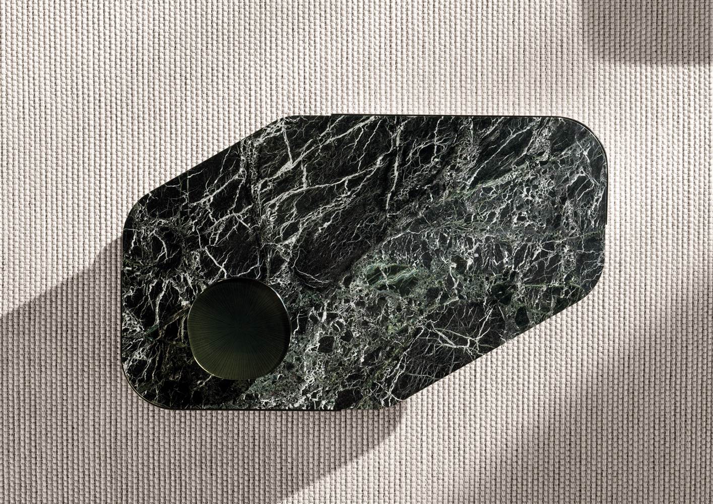 - plateau en marbre Verde Lepanto / tôle en acier inoxydable / plateau inférieur laquée couleur Mousse, en palissandre de Santos* ou palissandre de Santos* teinté Dark Brown ;