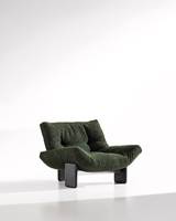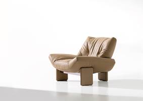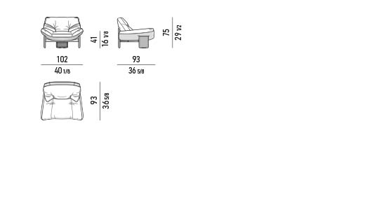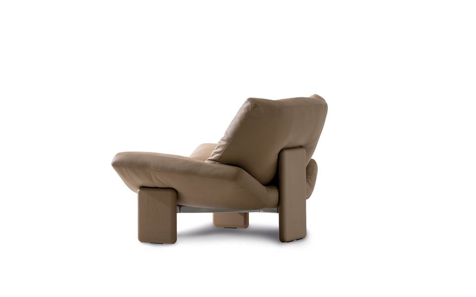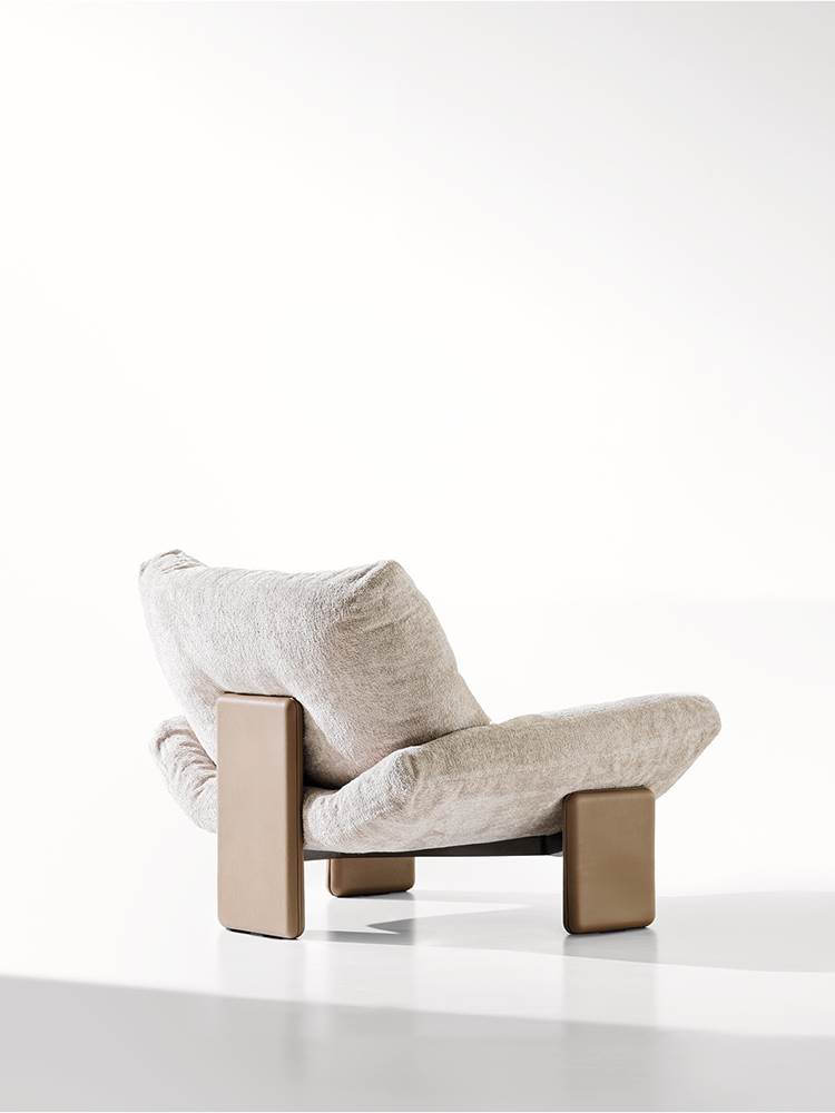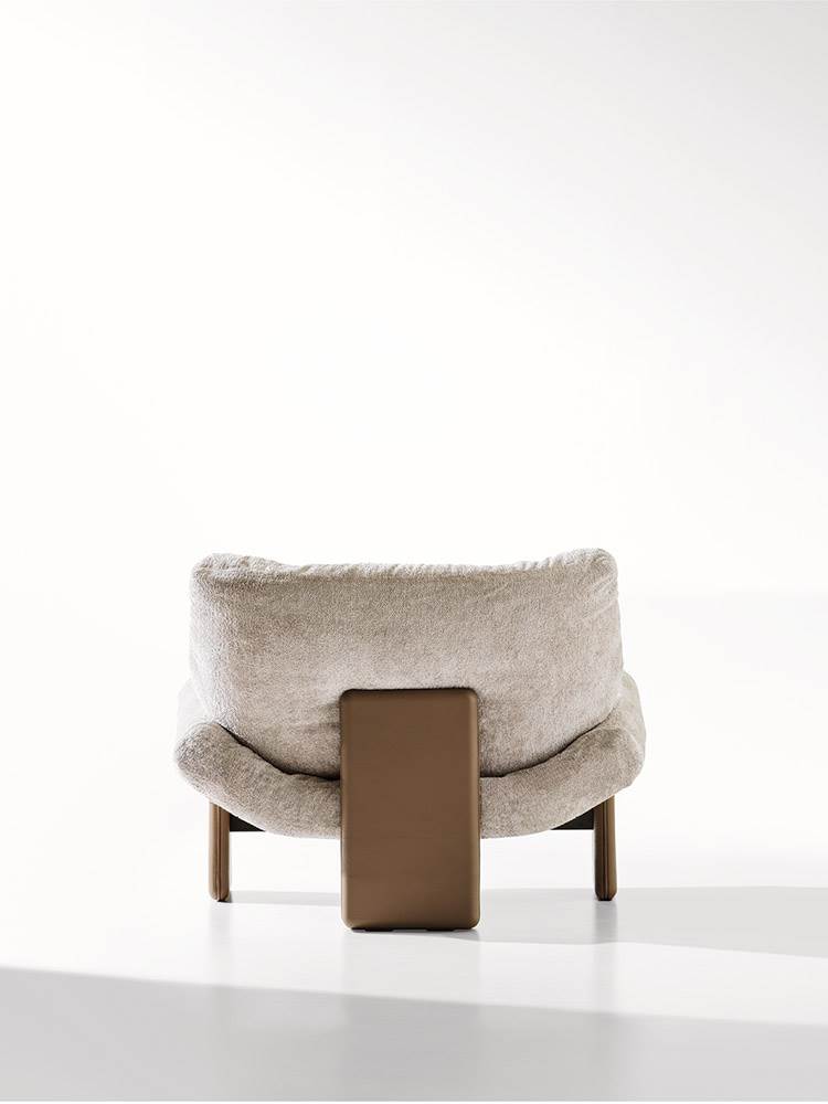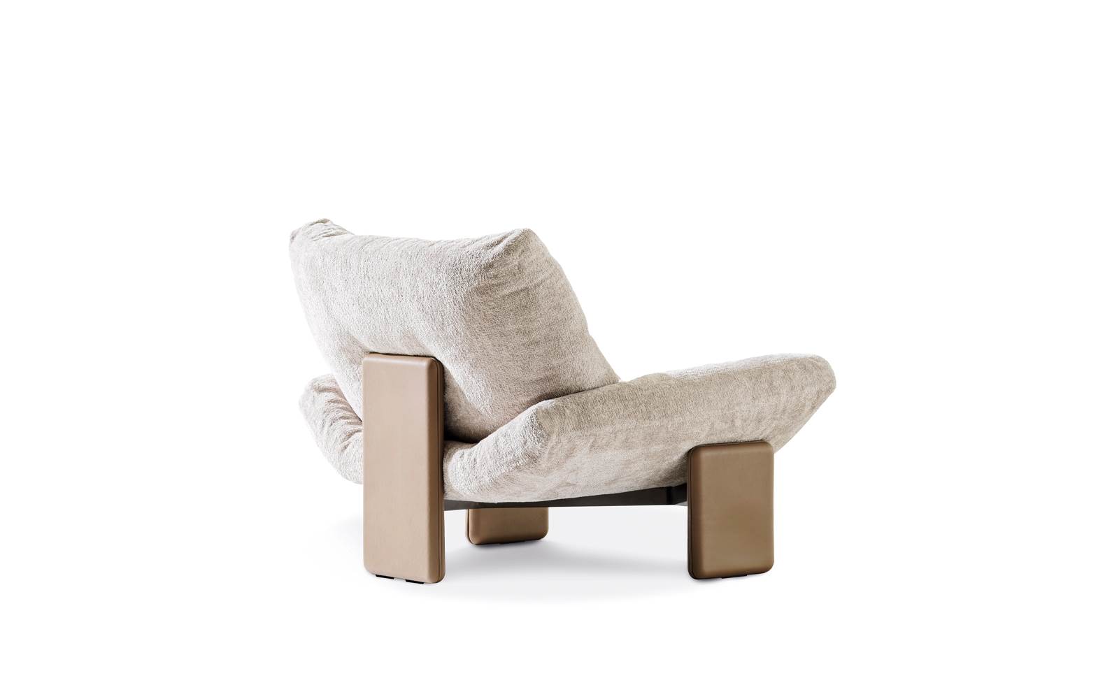 Son élégance sobre et son souci du détail se manifestent aussi bien dans la structure que dans le rembourrage : le capitonnage doux comme un nid, qui prend forme à partir de la rencontre de deux coussins, retombe sur la structure, l'habillant, mais laissant en même temps apparaître les deux pieds avant et le support architectural qui se trouve derrière.