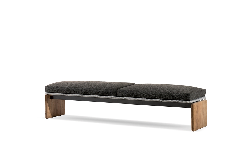 Le fauteuil Emmi, conçu pour l'intérieur, est décliné en banc Emmi Cord Outdoor pour les environnements en plein air.