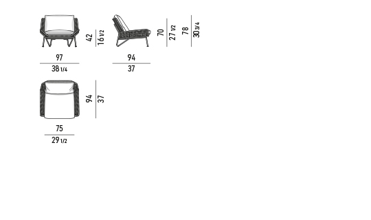 Le revêtement des coussins est entièrement déhoussable. Repose sur des embouts en acier inoxydable peint dans la même couleur que la structure (Écru, Marron Foncé ou couleur Bronze). Patins glisseurs en polyéthylène assortis à la structure, réglables.