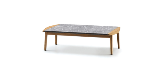 Les petites tables ont pour dénominateur commun la même forme que l’accoudoir en bois très légèrement incurvé que l’on retrouve à la fois dans la partie structurelle et latérale. La partie centrale de la petite table est sublimée par un plateau en marbre Calacatta qui donne naissance à un jeu de matières particulièrement raffiné.