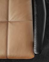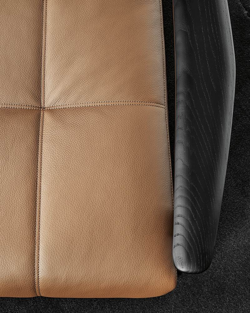 Dans la version Saddle-Hide du projet Fynn, l’assise et le dossier sont constitués d’un seul élément en cuir sellier. Le fauteuil et le petit fauteuil lounge accueillent des coussins rembourrés à poser (facultatif dans le cas du petit fauteuil dining).