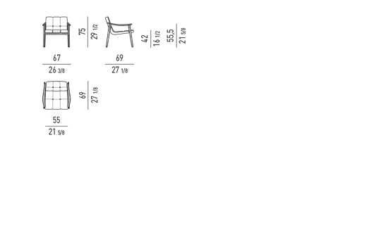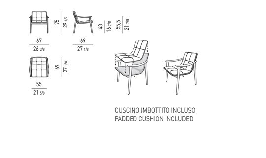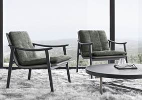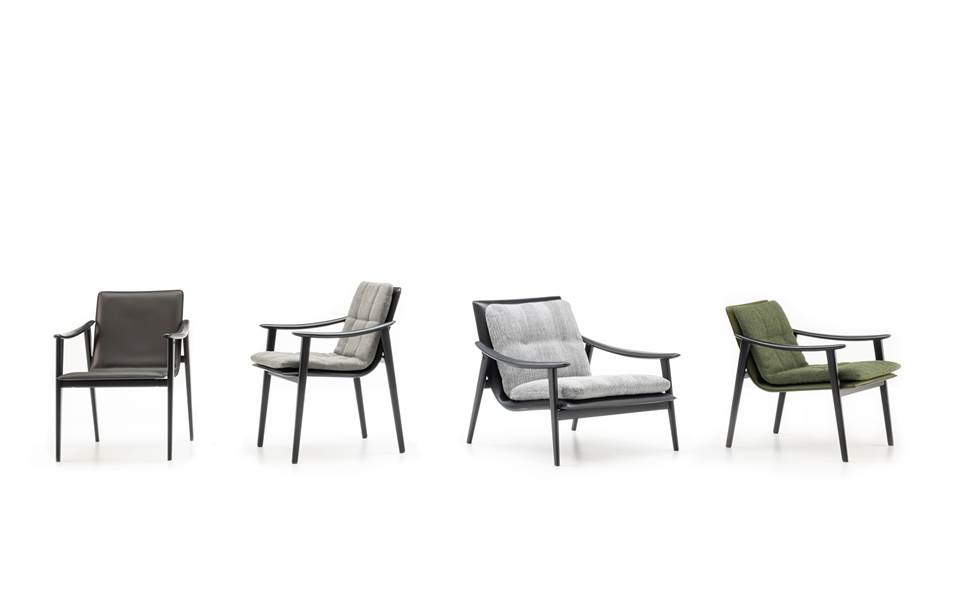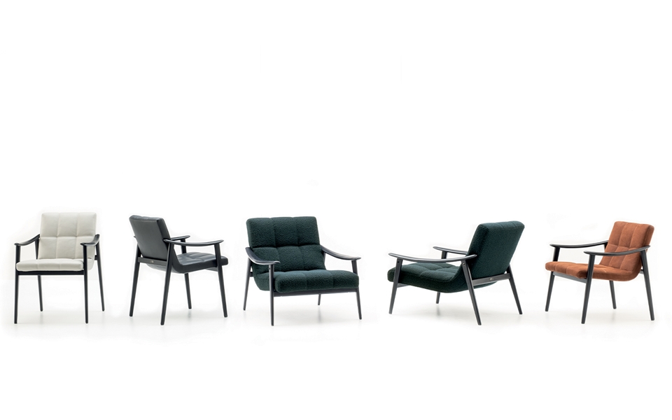 La collection comprend fauteuils, deux petits fauteuils - lounge et dining – des banquettes, repose-pieds et des petites tables.