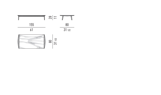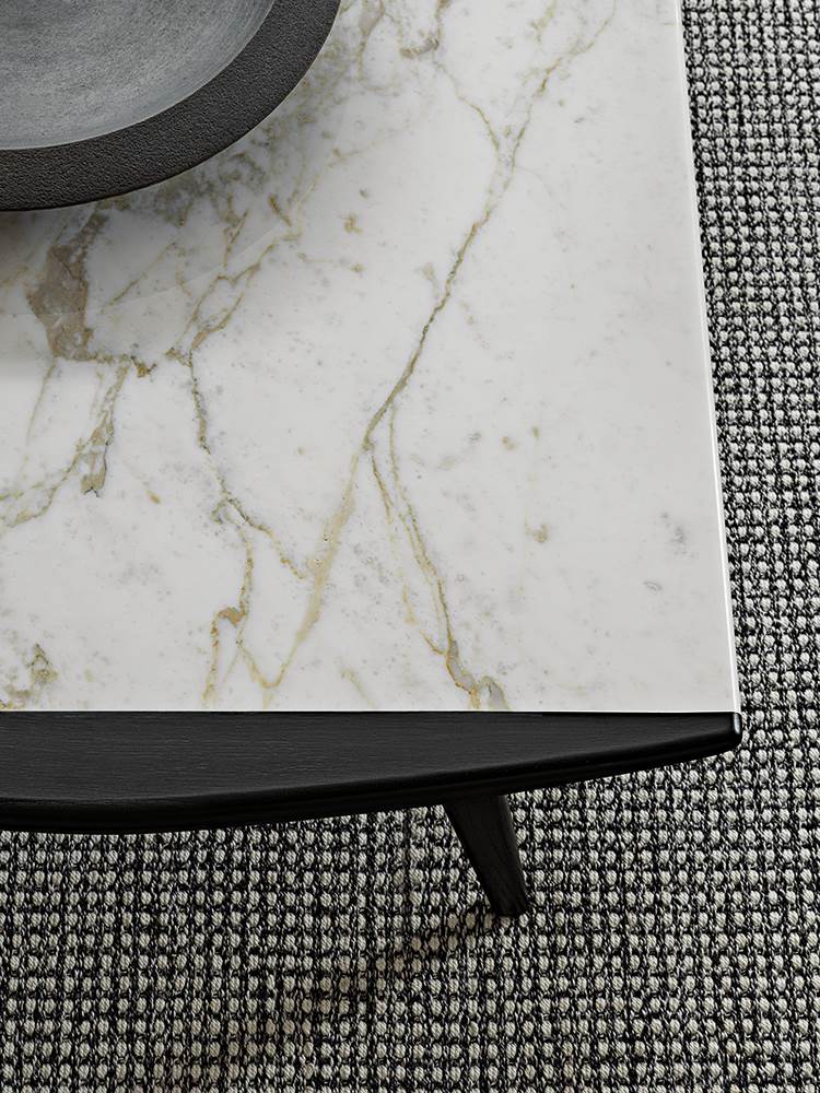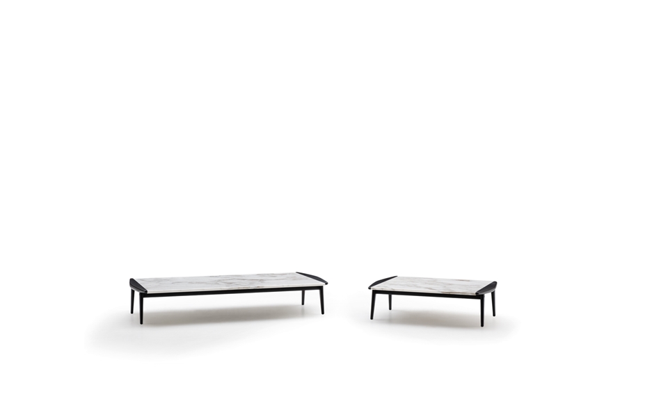 Les petites tables ont pour dénominateur commun la même forme que l’accoudoir en bois très légèrement incurvé que l’on retrouve à la fois dans la partie structurelle et latérale. La partie centrale de la petite table est sublimée par un plateau en marbre Calacatta qui donne naissance à un jeu de matières particulièrement raffiné.