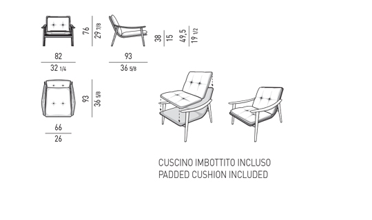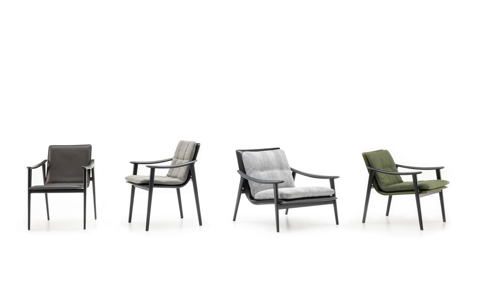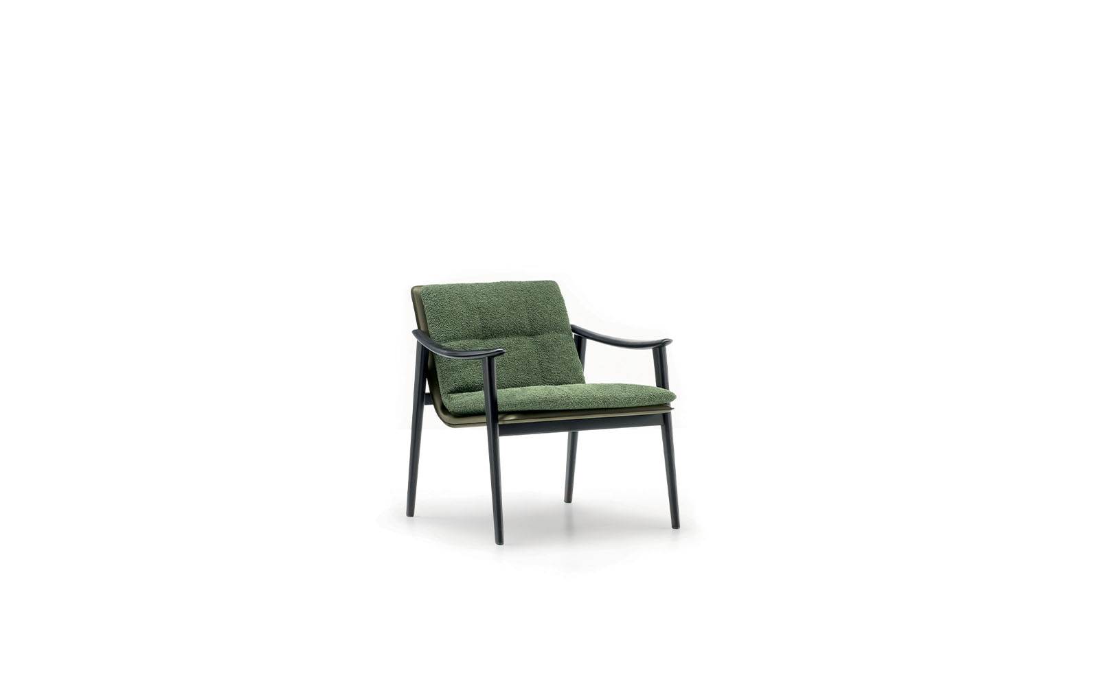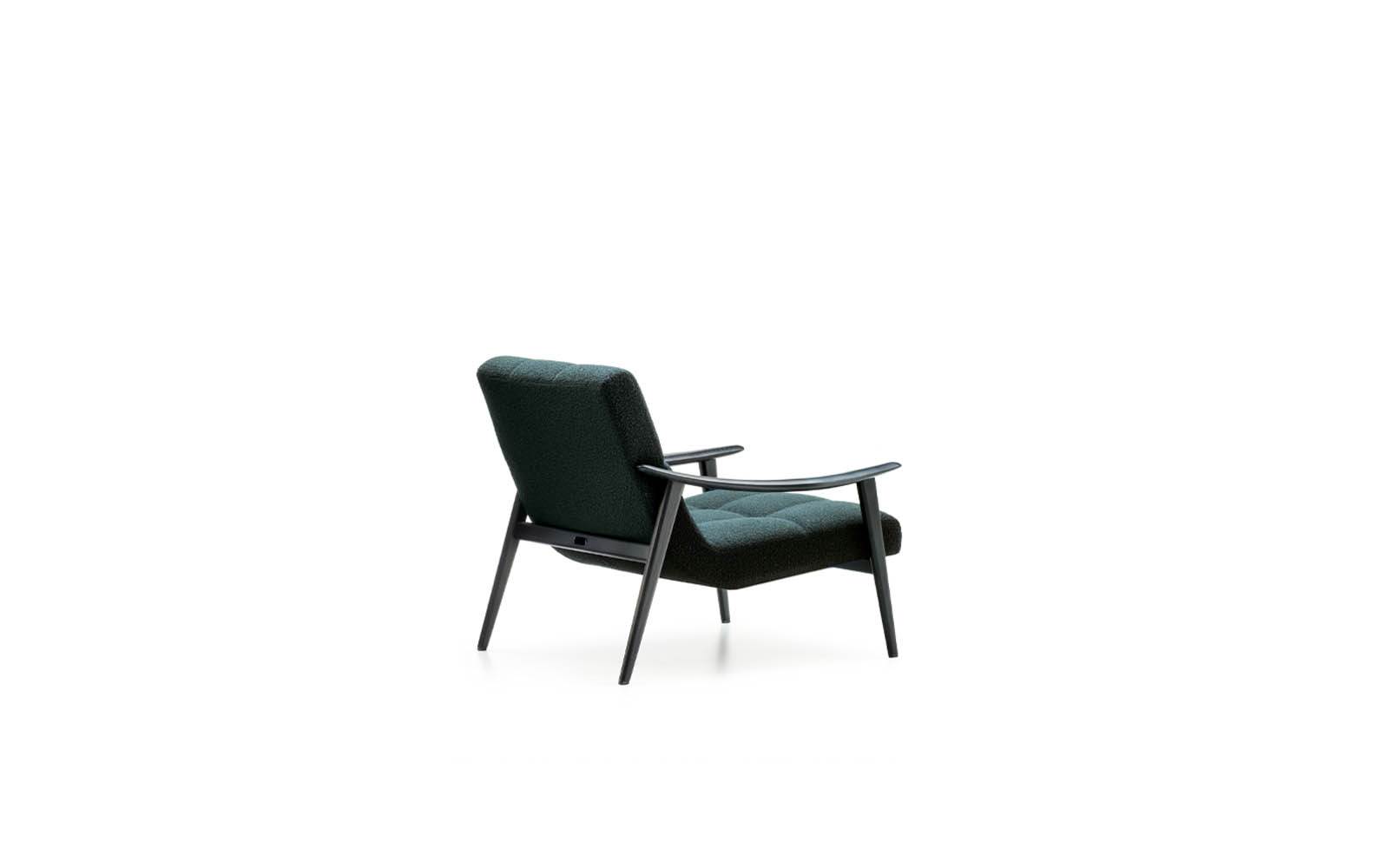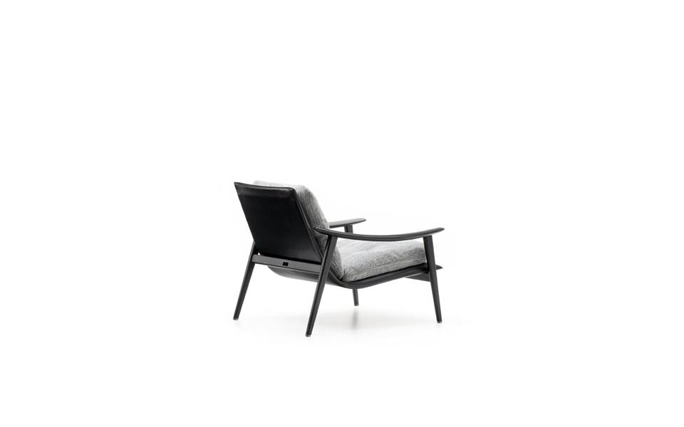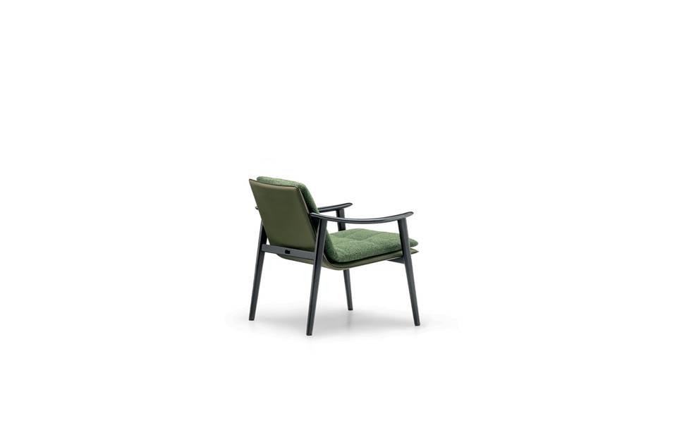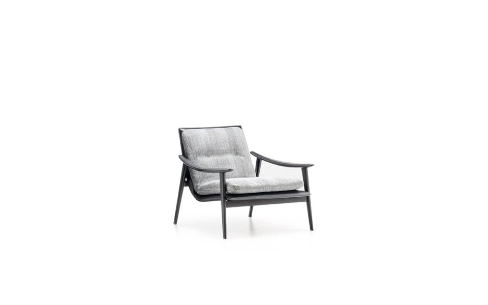 Le fauteuil et les petits fauteuils Fynn se distinguent par leur aspect très léger et leur structure essentielle en bois de frêne couleur Réglisse qui accueille le coussin rembourré de l’assise et dossier et qui constitue un seul et même élément. La rigueur informelle avec laquelle Fynn fait sien le rembourrage donne naissance à un siège confortable qui berce presque le corps de la personne qui s’assoit dans le chaleureux bois de la structure.