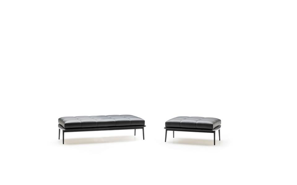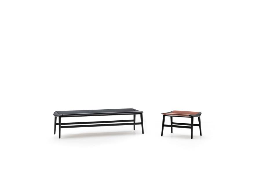Un repose-pied et des banquettes en dimensions différentes complètent la collection de sièges Fynn. Ces produits sont caractérisés par un coussin, à l’exception des banquettes dans la version Saddle-Hide, qui sont composées par une structure avec surface concave et à la quelle on assortit le revêtement en cuir sellier, qui l’enveloppe comme un cuir précieux.