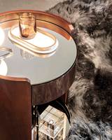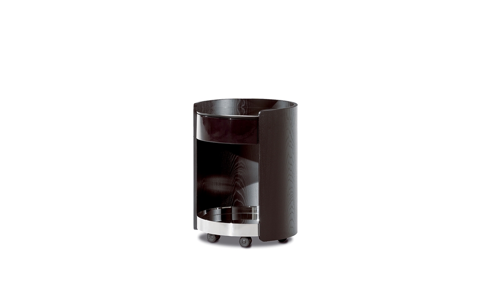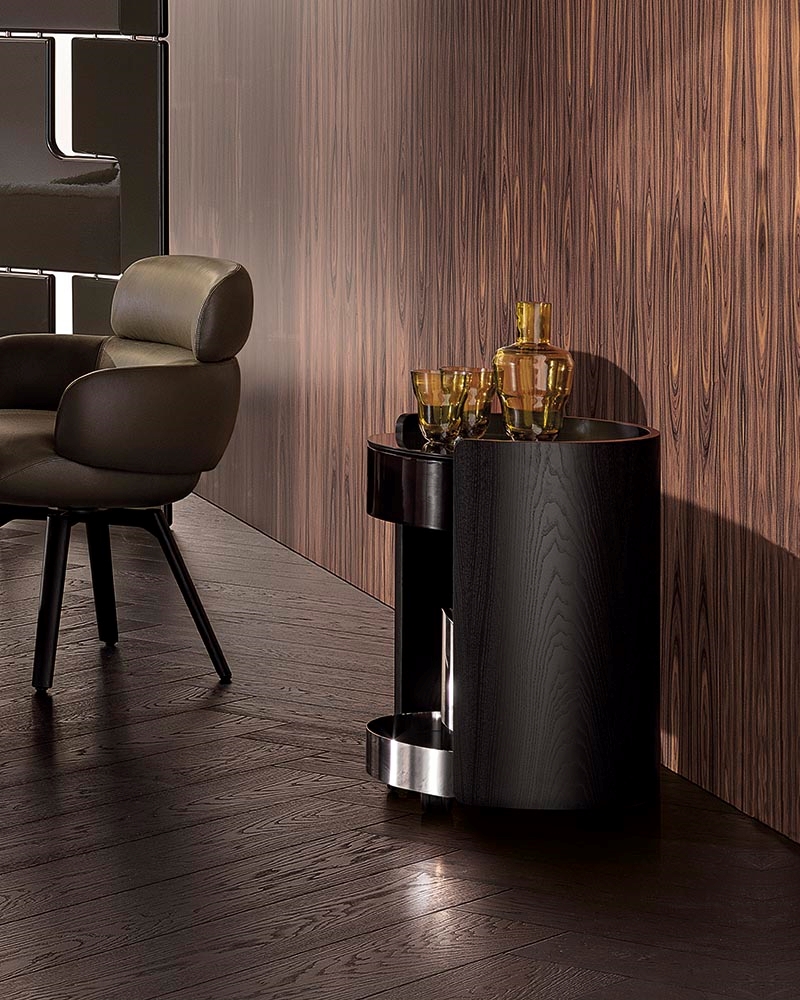 Journey se caractérise par une structure cylindrique en bois laqué qui accueille un compartiment central pour les bouteilles, un tiroir supérieur laqué Moka et un dessus en miroir, idéal pour ranger des objets.