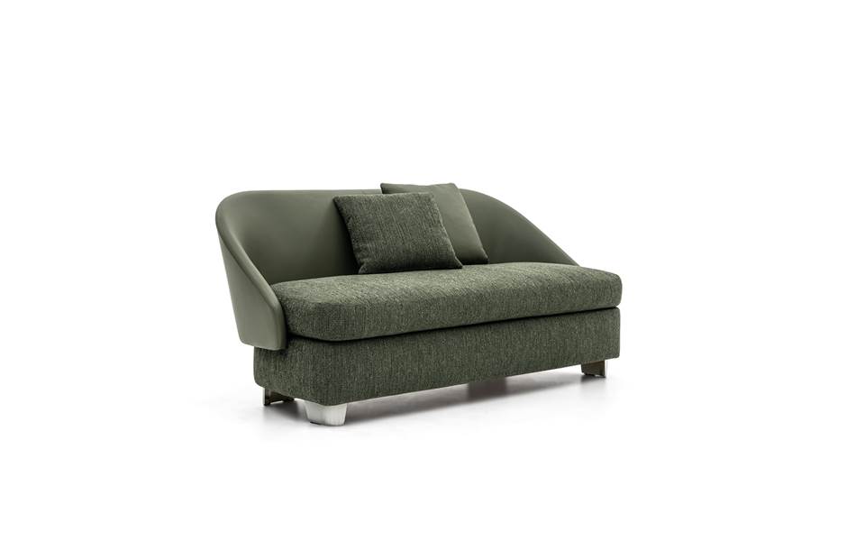 Son design joue esthétiquement sur le mariage des matières, entre le cuir qui épouse la courbe du sinueux dossier devenant à son tour accoudoir et le tissu de style haute couture des coussins.