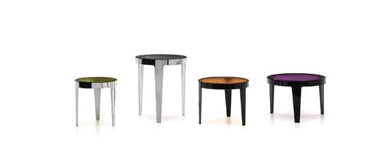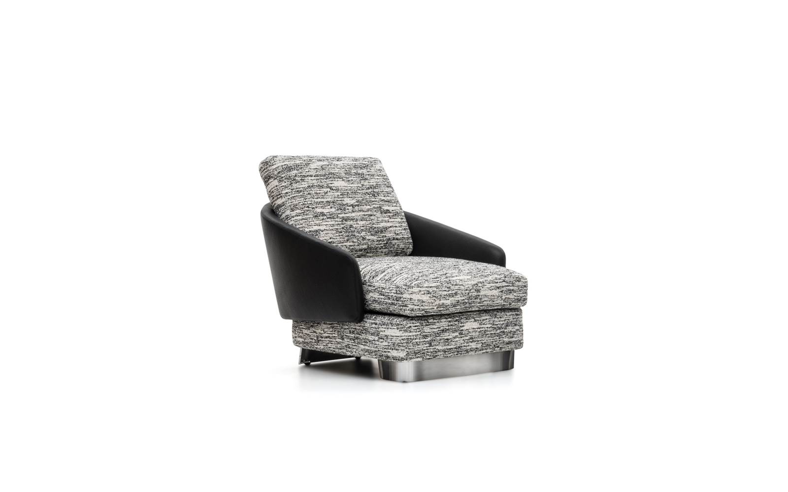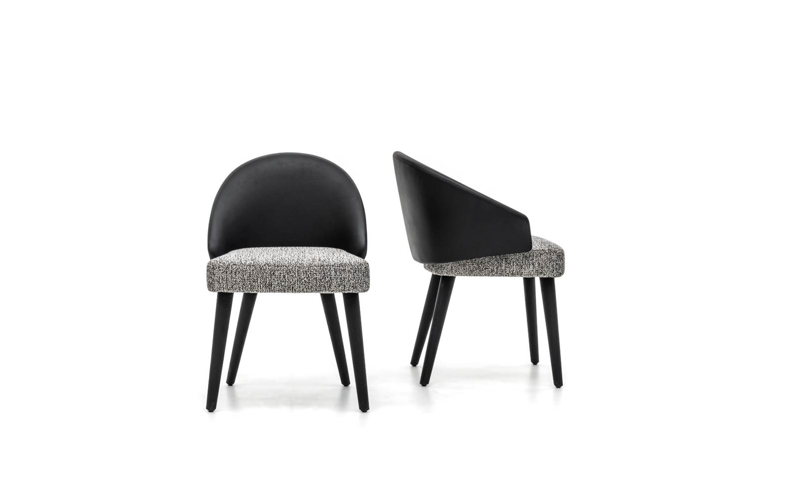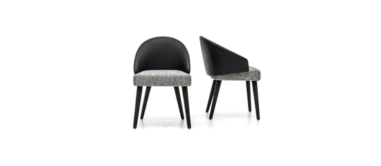Chaque produit peut être décliné dans de multiples combinaisons de matériaux et de couleurs : des versions très années 70 alliant cuir noir, revêtement textile structuré et pieds finition chrome à un style plus décoratif dans les variantes velours ou chenille.