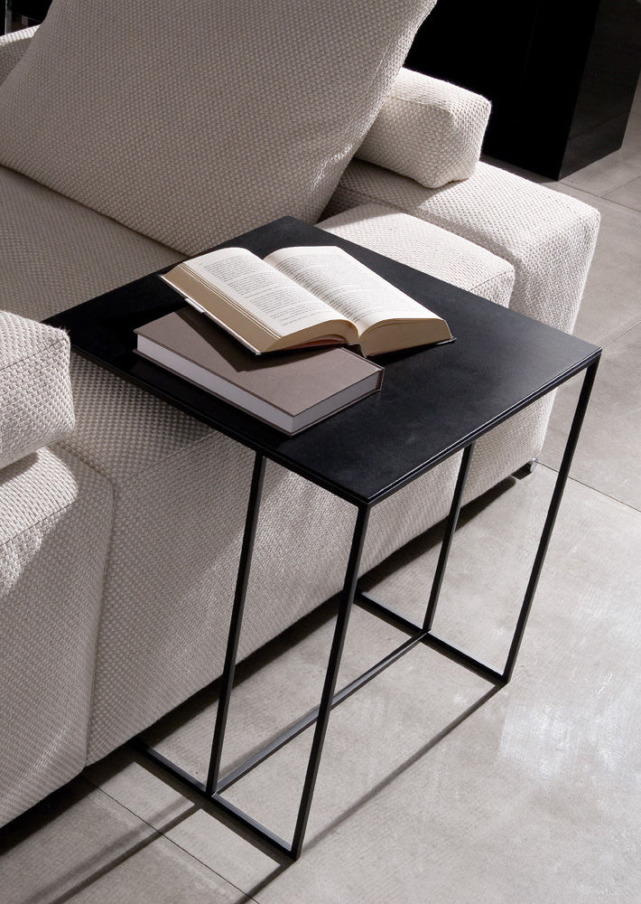 Structure : en fer plein verni avec une poudre époxy cuite au four (200°C) di- sponible uniquement dans le couleur Noir mat. Plateau : en cuir sellier Noir.