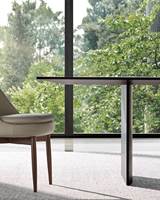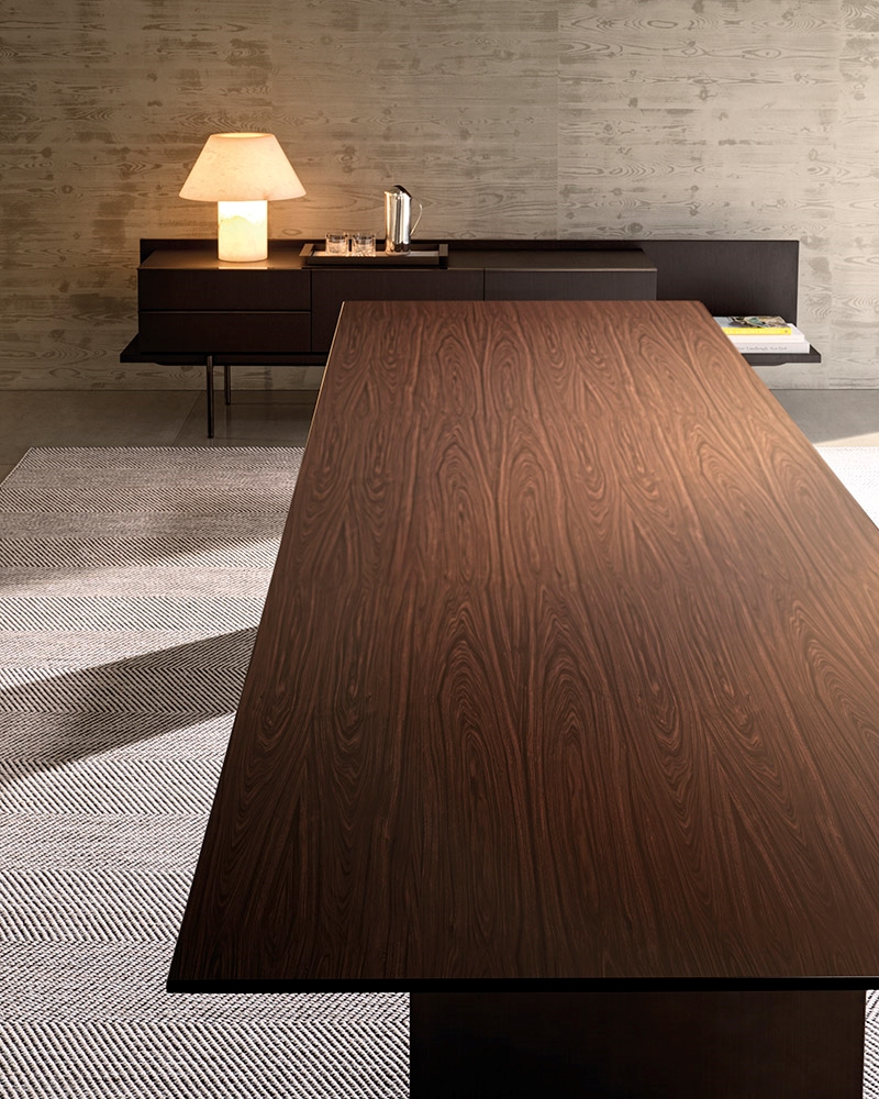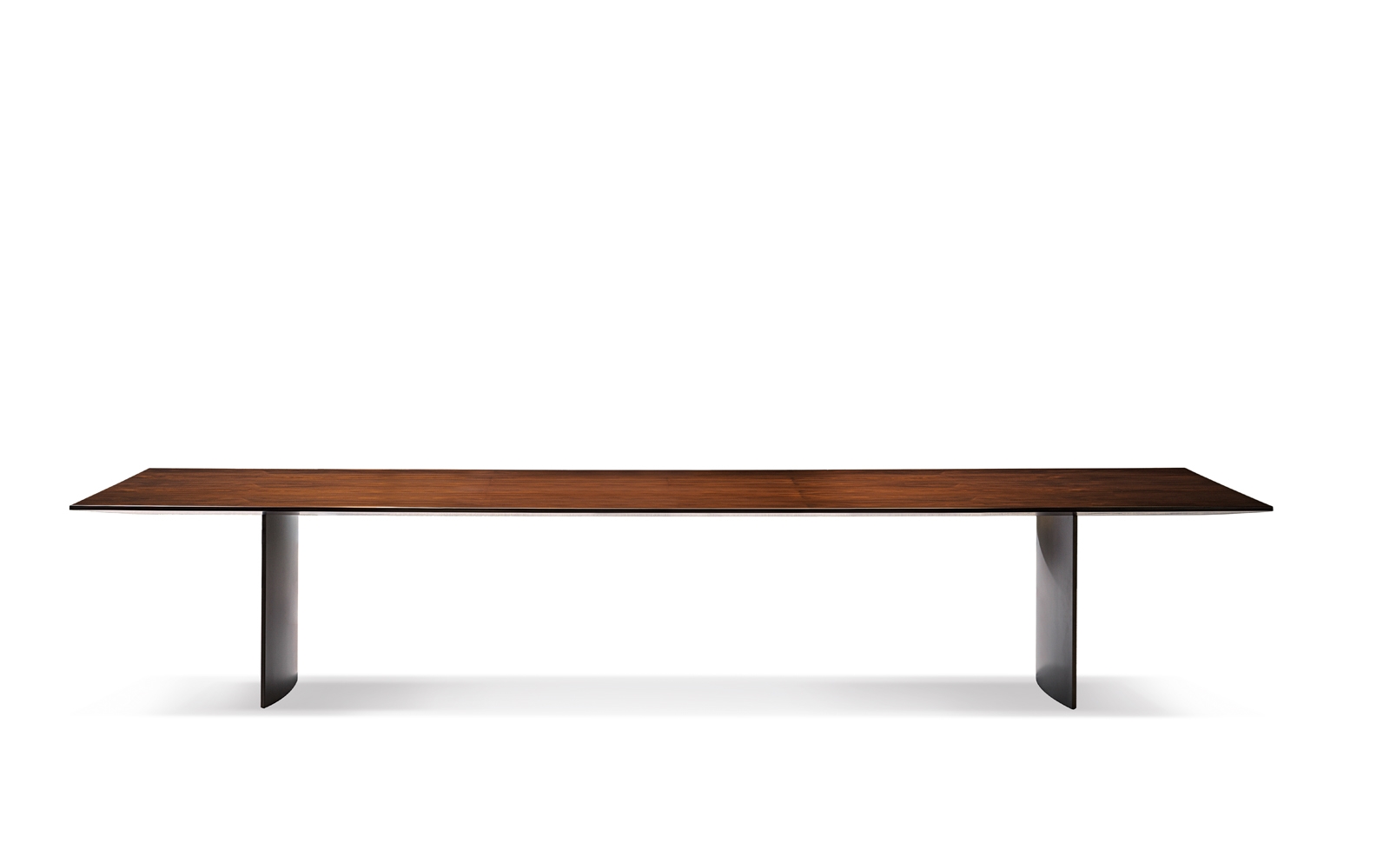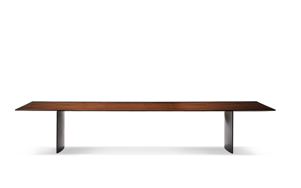 L’évolution de la table Linha de Marcio Kogan / Studio MK27 ayant donné naissance à Linha Fina est le fruit d’un défi créatif très stimulant : obtenir un plateau en palissandre Santos ou teinté Dark Brown laqué polyester mat ou en frêne laqué Noir extrêmement fin d’une épaisseur périmétrique de 16 mm seulement : telle est la ligne devenant volume qui caractérise cet objet à la fois léger et sculptural.