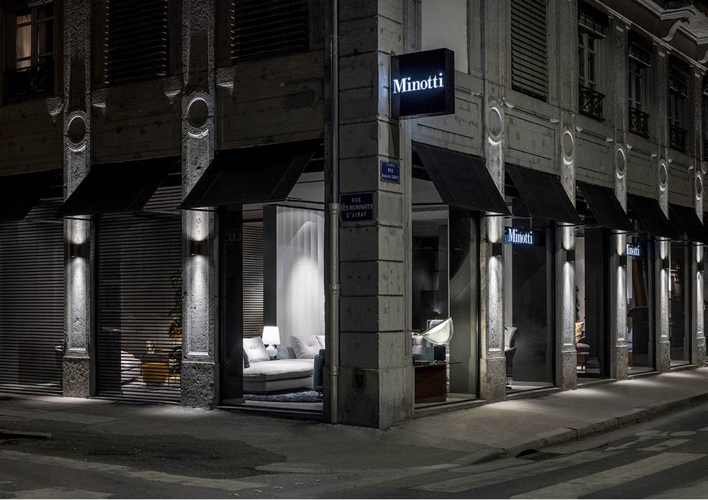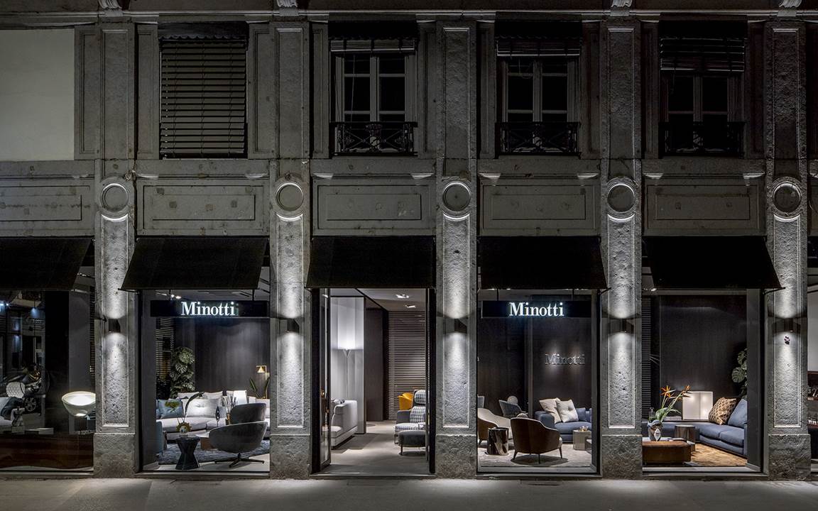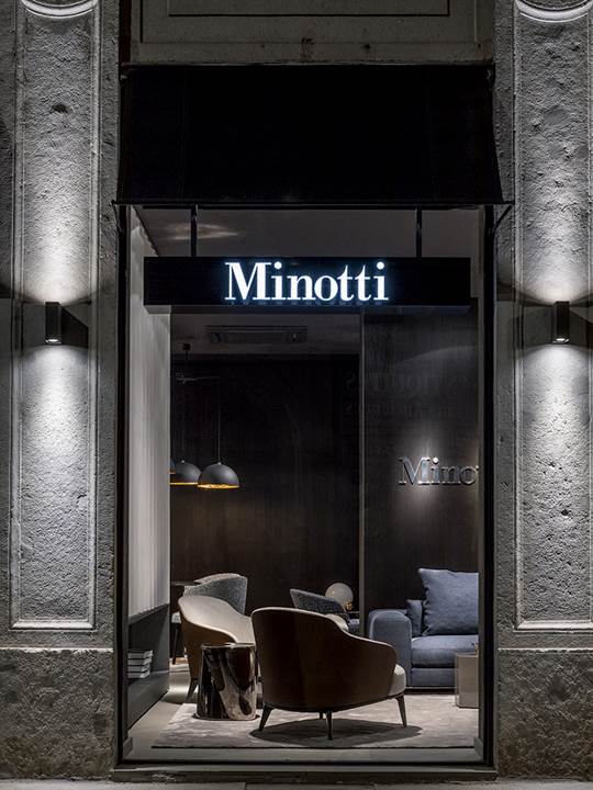 grâce à l’ajout de systèmes d’éclairage intégrés affichant le nom de la marque et invitant les visiteurs à découvrir la boutique. L’intérieur se distingue quant à lui par une originale palette de couleurs et d’éléments décoratifs, notamment par un jeu de plusieurs essences de bois, une large sillon dorique sur le mur et des sols en béton. Cette atmosphère moderne et décontractée est le décor à certains des produits indémodables les plus vendus par Minotti, notamment le système de sièges Freeman assorti avec les fauteuils Leslie, le canapé Jacques agrémenté des petites tables Ring et la table Lou avec les chaises Aston « Dining ». Quant aux produits des collections les plus récentes, on trouve le système de sièges Alexander, les fauteuils et les bergères Tape ainsi que les petites tables Ring et Bender.