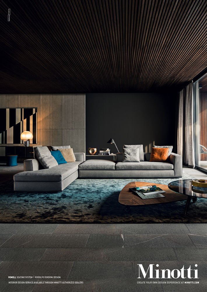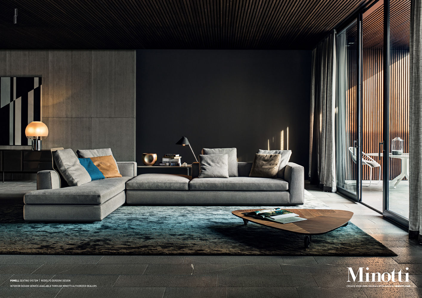 Powell représente la quintessence du canapé contemporain selon Minotti : à la fois accueillant, raffiné et informel. Ces caractéristiques sont mises en exergue dans l’image publicitaire où des matériaux précieux, comme la pierre des murs qui contraste avec la chaleur du bois utilisé pour réaliser le plafond, servent de cadre à une composition d'angle du canapé.