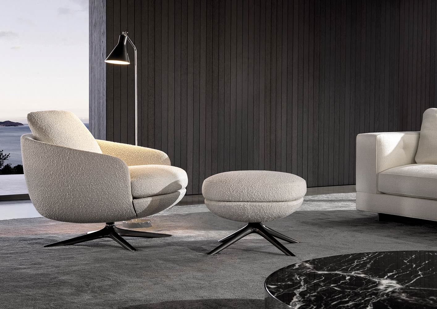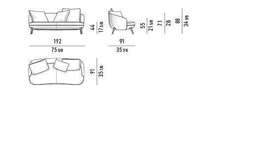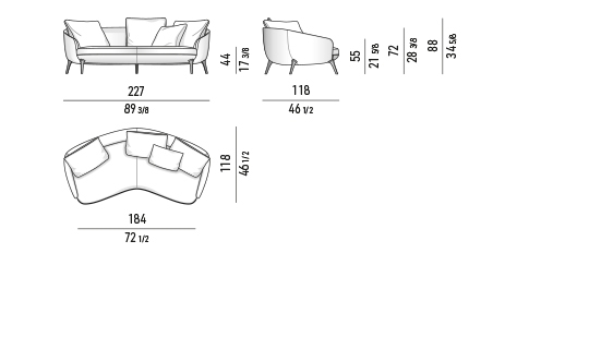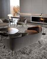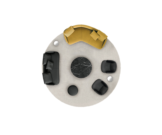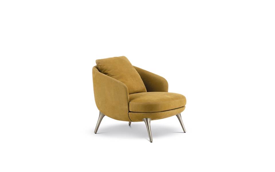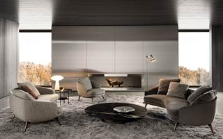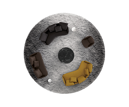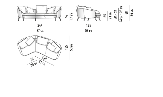Les fauteuils sont disponibles aussi avec une base pivotante à quatre rayons en aluminium moulé sous pression en Bronze or en Étain brillant. Chaque élément de la gamme se distingue par sa propre personnalité et sa propre silhouette. Les canapés se déclinent en trois versions : linéaire, semi-incurvée et semi-incurvée asymétrique. Cette dernière version est rythmée par la succession de lignes sinueuses créée par le léger changement de hauteur du dossier.