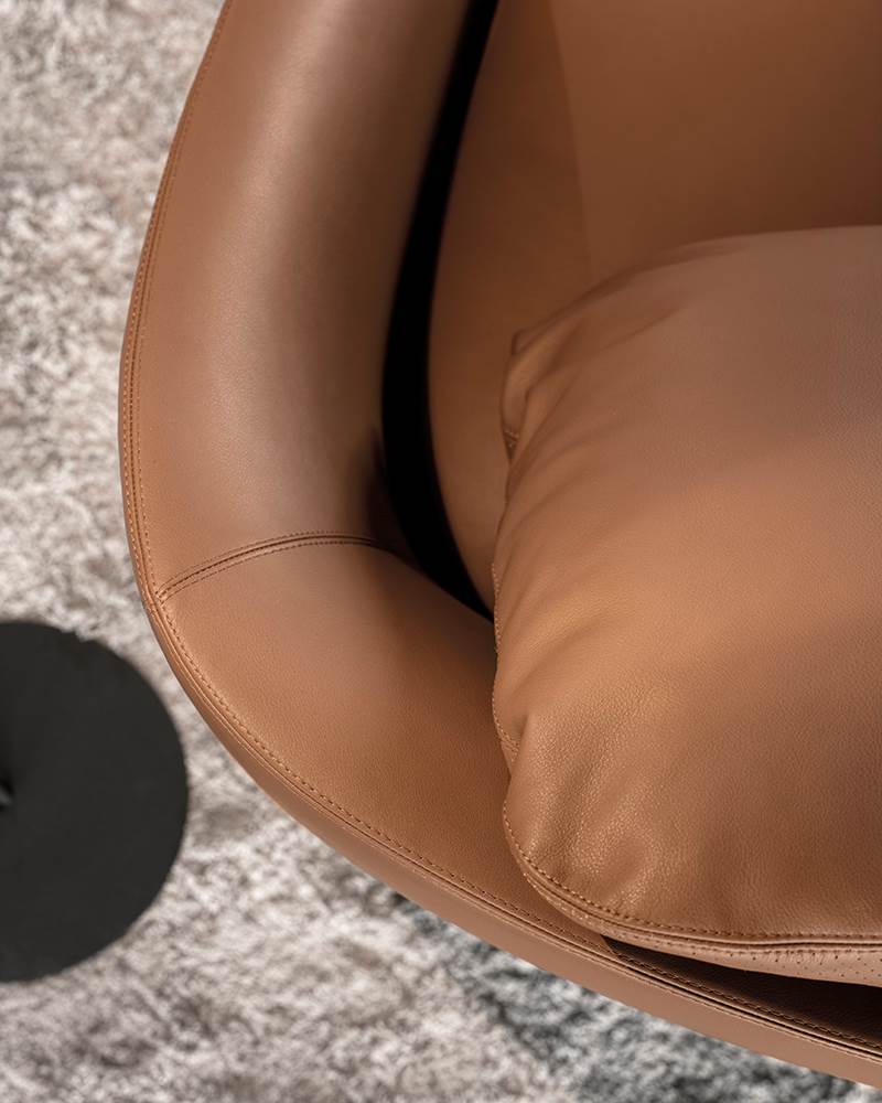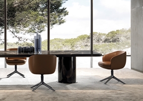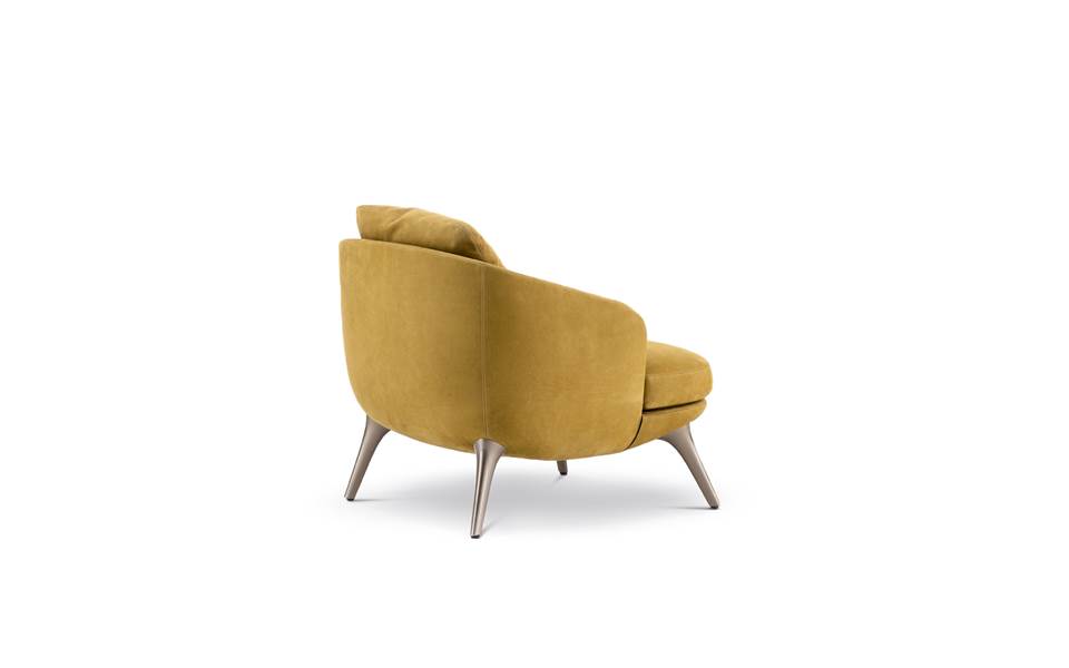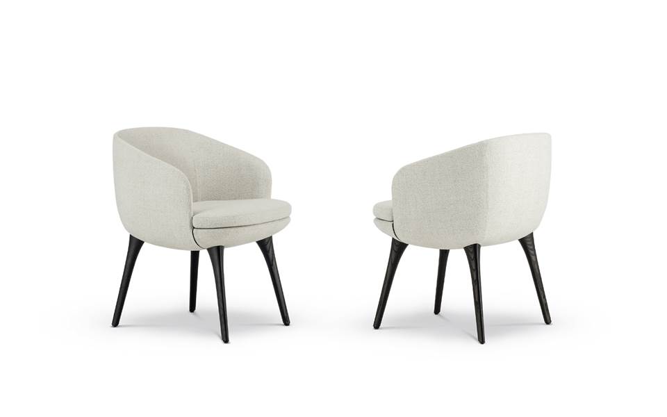 Les fauteuils se distinguent par un grand confort, non seulement dans le modèle le plus généreux, mais aussi dans celui de plus petite taille et dining, disponible soit en version fixe avec des pieds en frêne couleur Réglisse soit en version pivotante sur base à quatre branches en aluminium moulé sous pression Bronze ou Étain brillant.