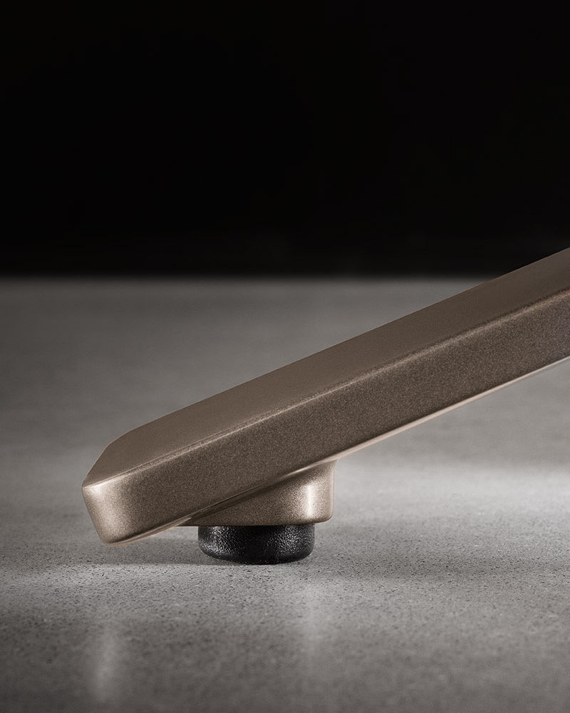 Dans le cas de Reeves Small avec base fixe, le dos du fauteuil repose sur un support en métal peint brillant couleur Bronze et l’avant sur des pieds en Sucupira massif teinté Vison.