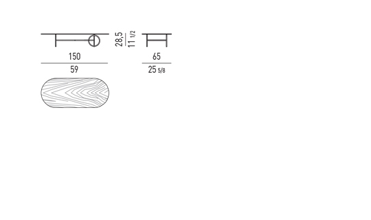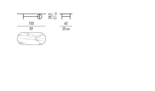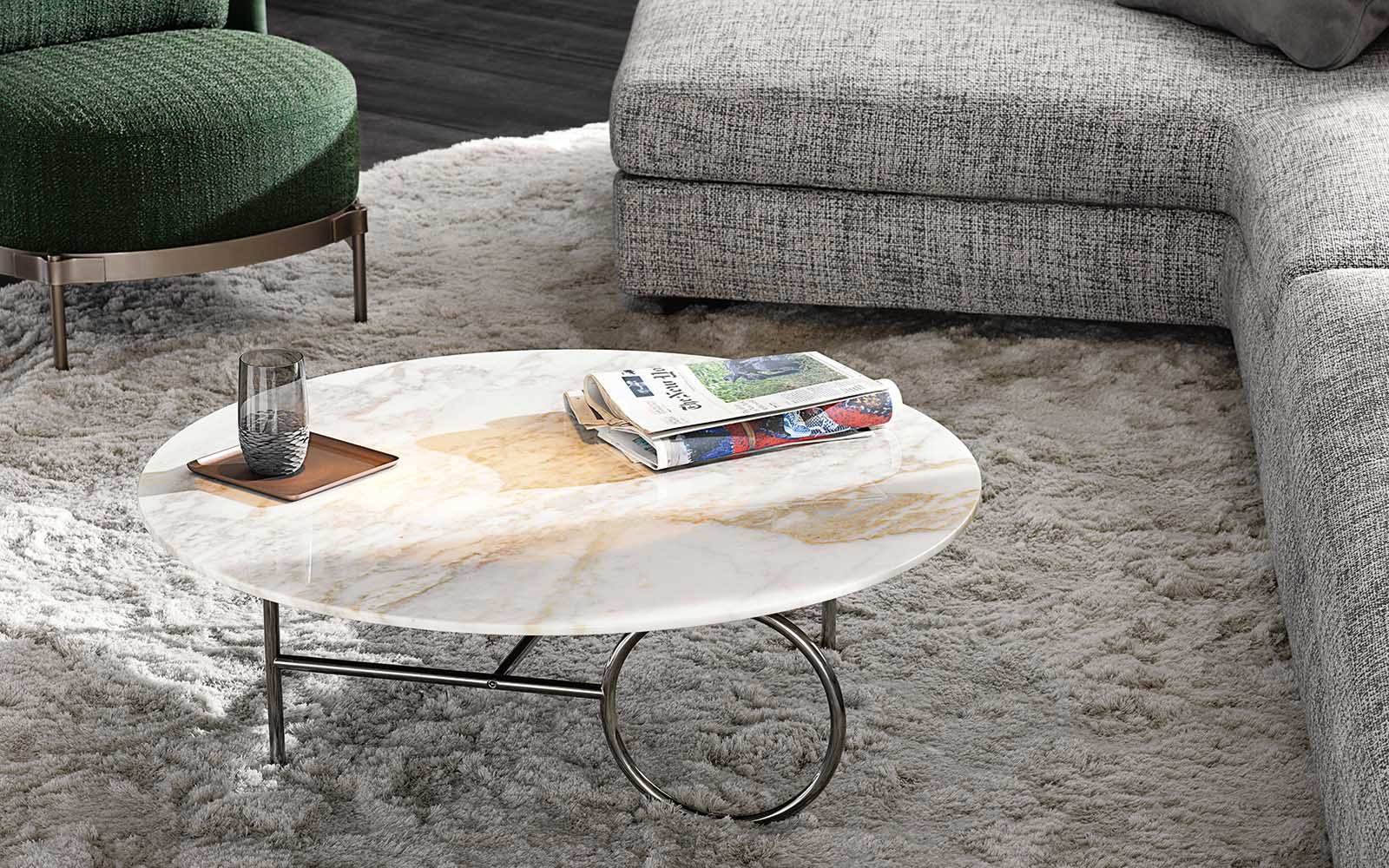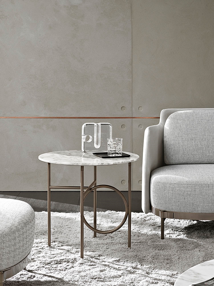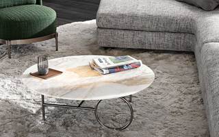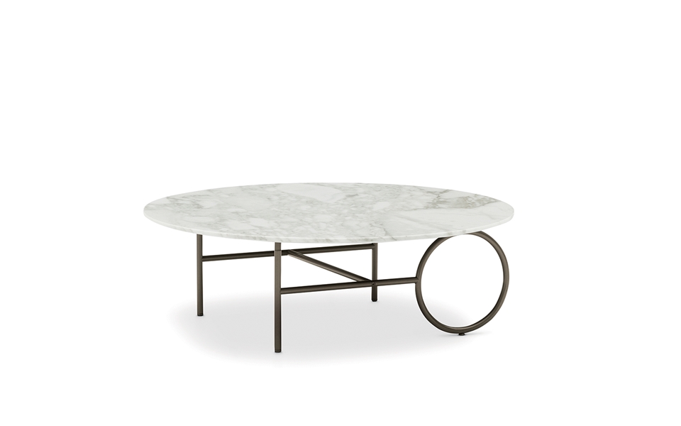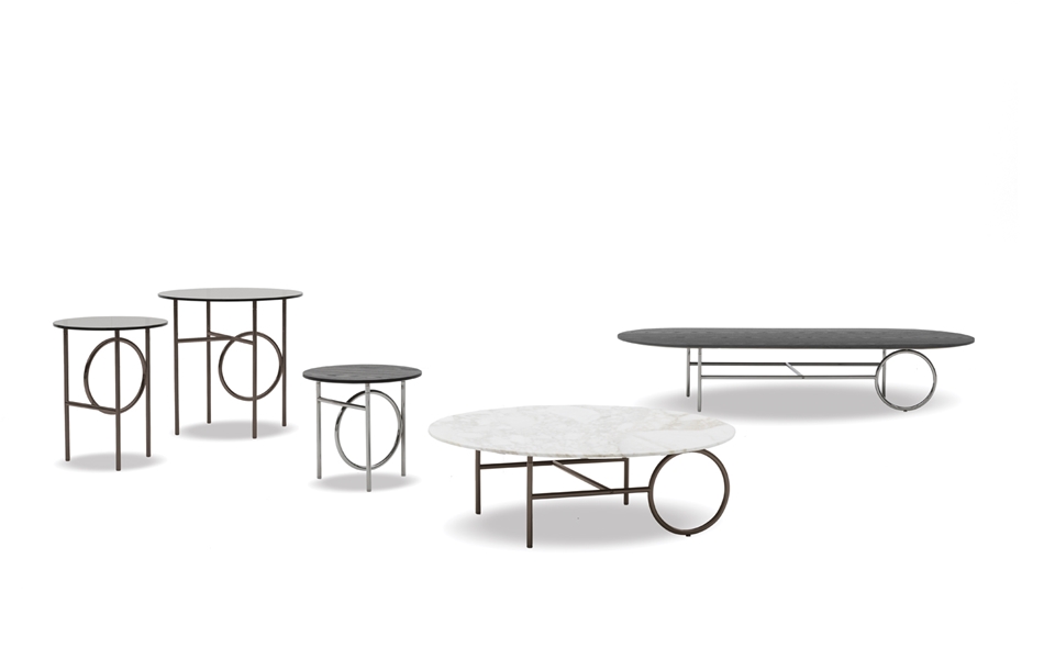 L'armature en métal, en Bronze ou Black-Nickel, est disponible dans différentes tailles. Les tables Ring sont complétées par un plateau ovale ou circulaire, de différents diamètres, personnalisables en verre bronzé, en marbre Calacatta ou en frêne brossé couleur Réglisse.