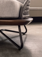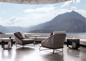 La série Rivera comprend des canapés deux ou trois places, des fauteuils, des poufs, une petite table et un petit fauteuil qui, grâce à des matériaux innovants, proposent une interprétation contemporaine d’une élégance rétro, pleine de suggestions rappelant les atmosphères accueillantes, typiquement méditerranéennes, des vérandas en bord de lac ou des terrasses sur la mer.