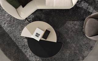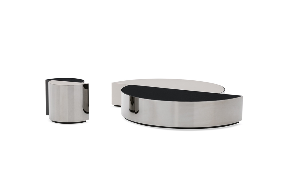 Un jeu de noir et blanc caractérise les deux demi-cercles décalés, à la fois sur la surface de la table et sur la section verticale interne, grâce aux nuances contrastées de la laque brillante Pewter et de la couleur Sable.