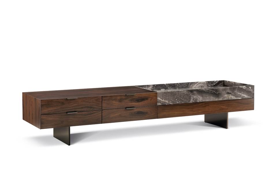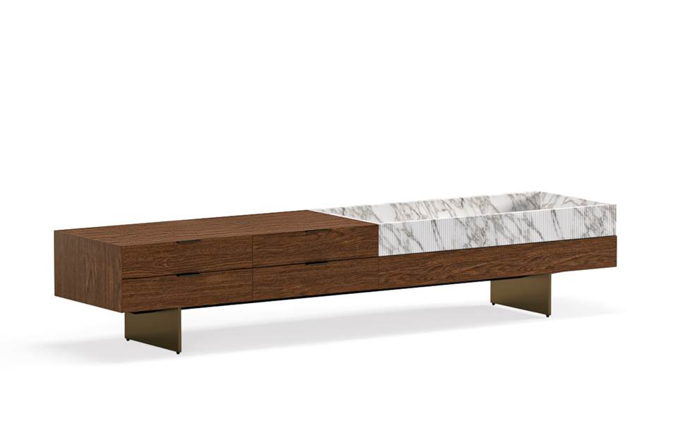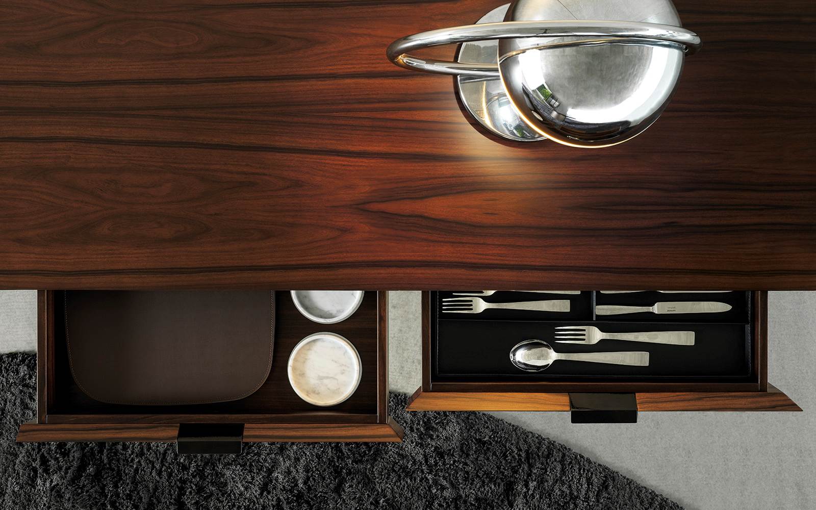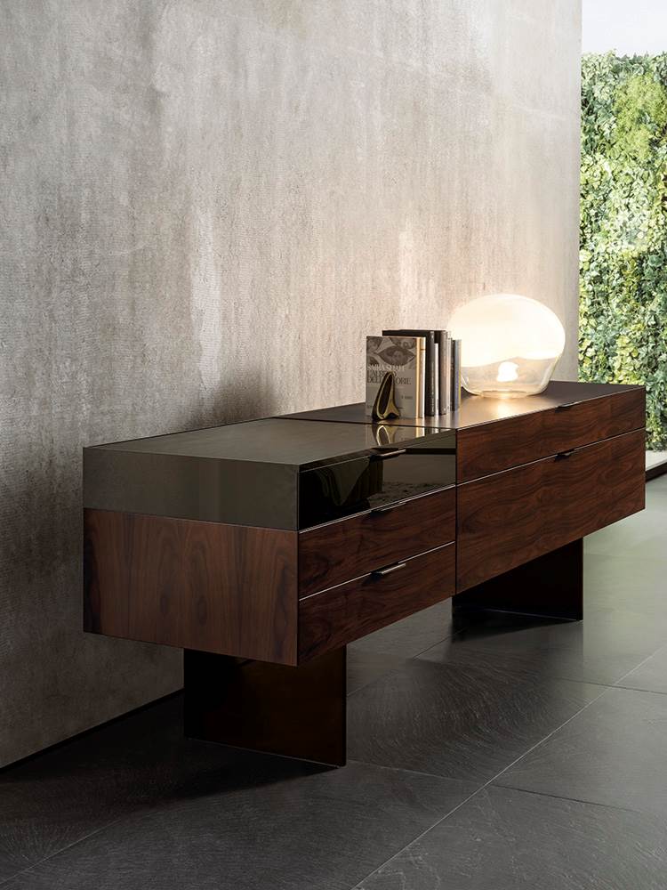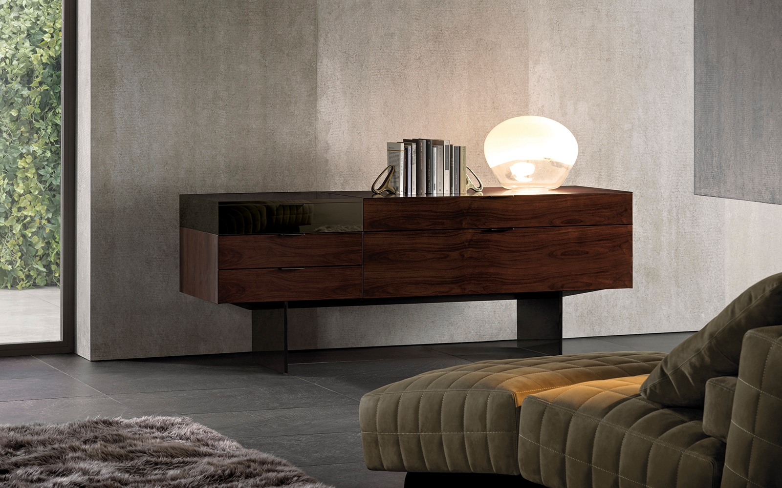 Conçu comme une véritable architecture, il se caractérise par un élément de rangement en bois ou laqué brillant disponible dans plusieurs finitions et reposant sur des lames en métal Brandy brillant. Meuble non seulement décoratif mais également fonctionnel, il a été pensé pour trouver sa place dans de multiples espaces, notamment grâce aux formes et aux accessoires de la gamme qui s’adaptent aux usages les plus divers. Dans les versions pour les séjours et les salles à manger, le meuble peut par exemple accueillir un élément en marbre brossé à forte personnalité spécialement étudié pour ranger des objets. Très raffiné, le plateau range-couverts en cuir noir, idéal pour les salles à manger, représente un autre accessoire particulièrement intéressant. Dans la version pensée pour la chambre, Superblocks comprend un très beau tiroir à bijoux doté d’un plateau en verre armé.