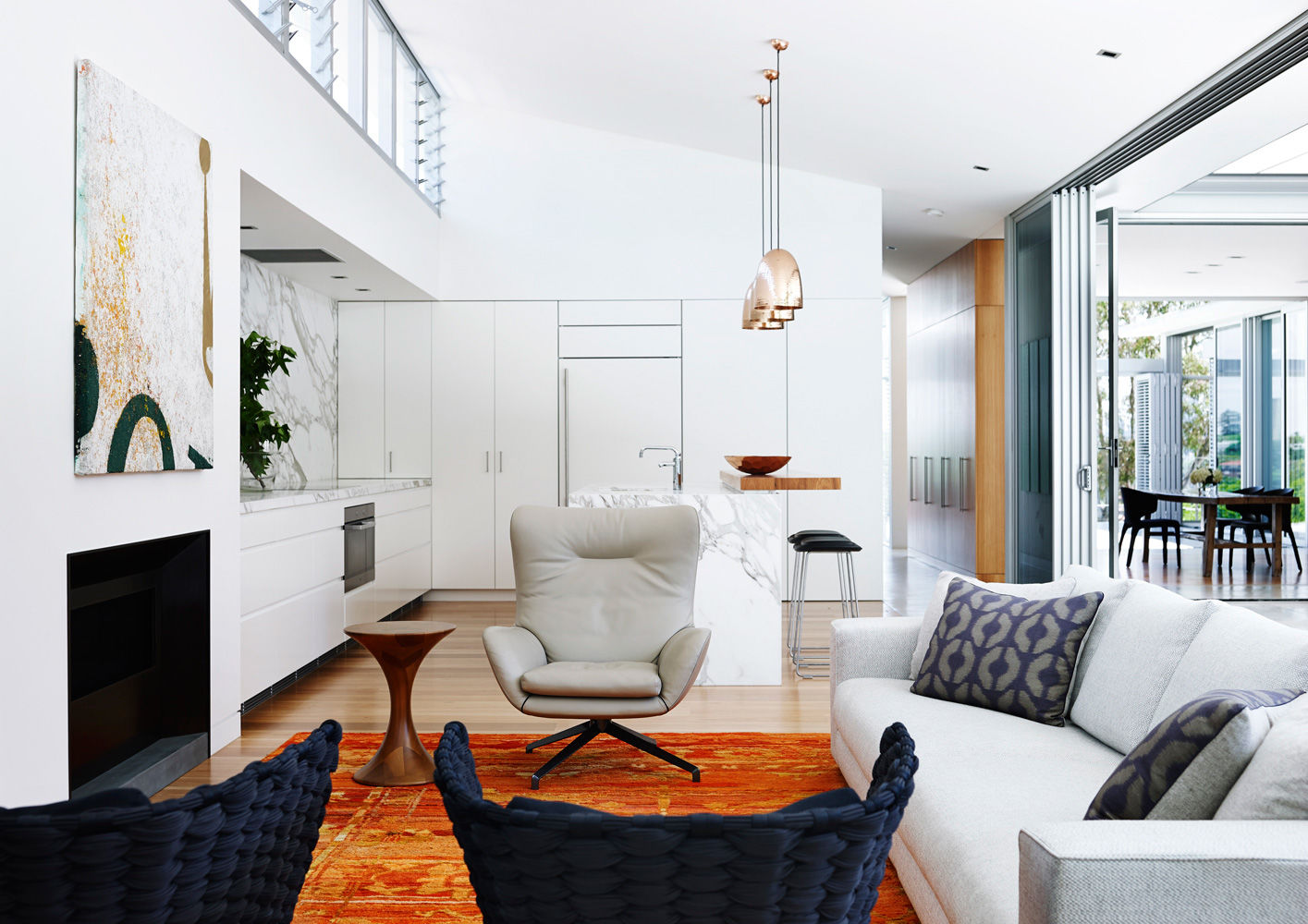 Le projet de la Pavilion House de Sydney fait siens ces éléments primaires, les traduisant en une construction harmonieuse qui conjugue élégance et commodité. Ouvert sur le jardin avec piscine, le vaste séjour lumineux accueille une composition linéaire du système de sièges Hamilton flanquée d’un fauteuil Jensen et d’une petite table Kitaj.